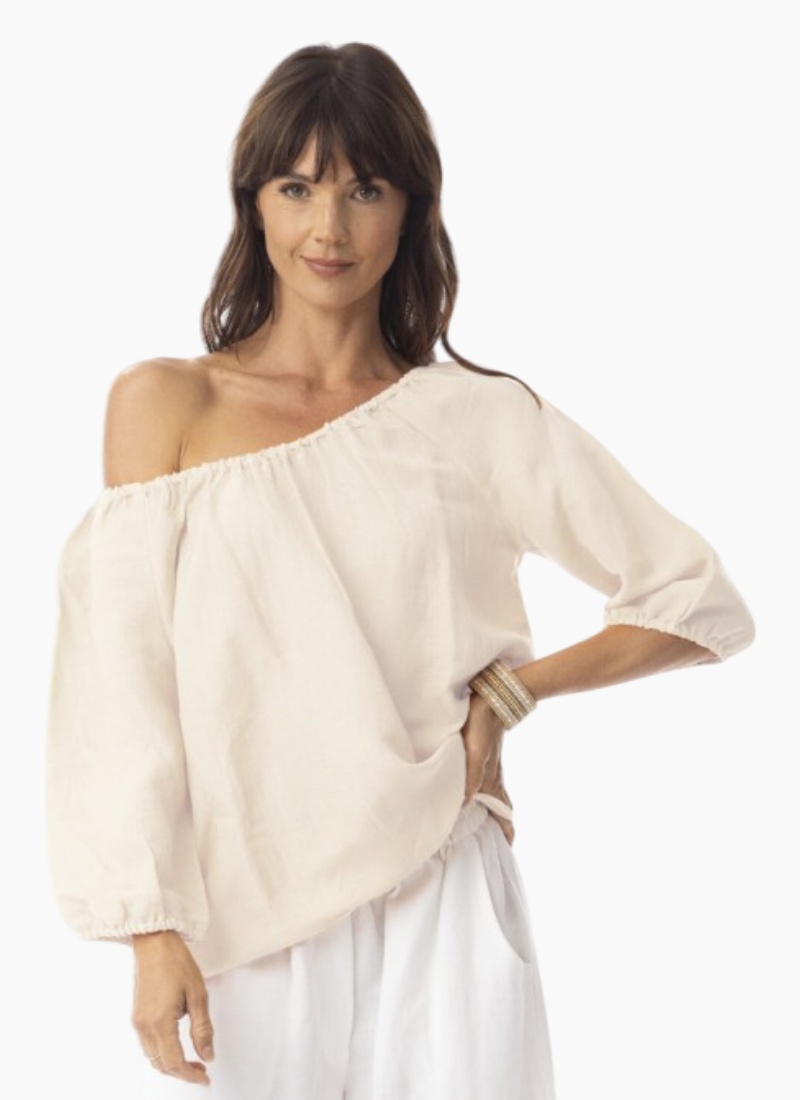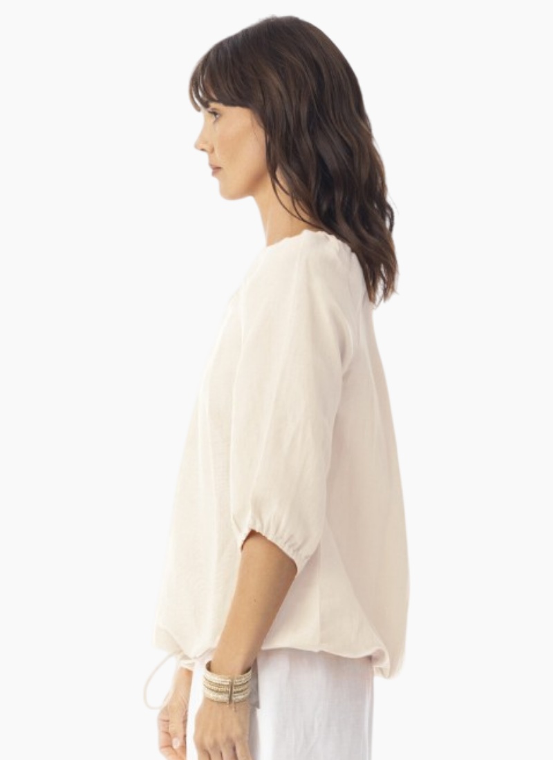 Introducing the Escape Linen Solid Gather Top Sand. This breezy piece from Escape brings understated elegance to warm-weather wardrobes with its soft sand hue and linen texture.