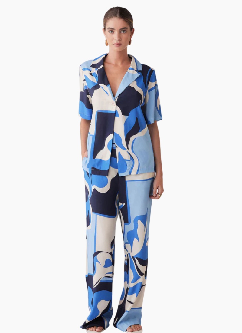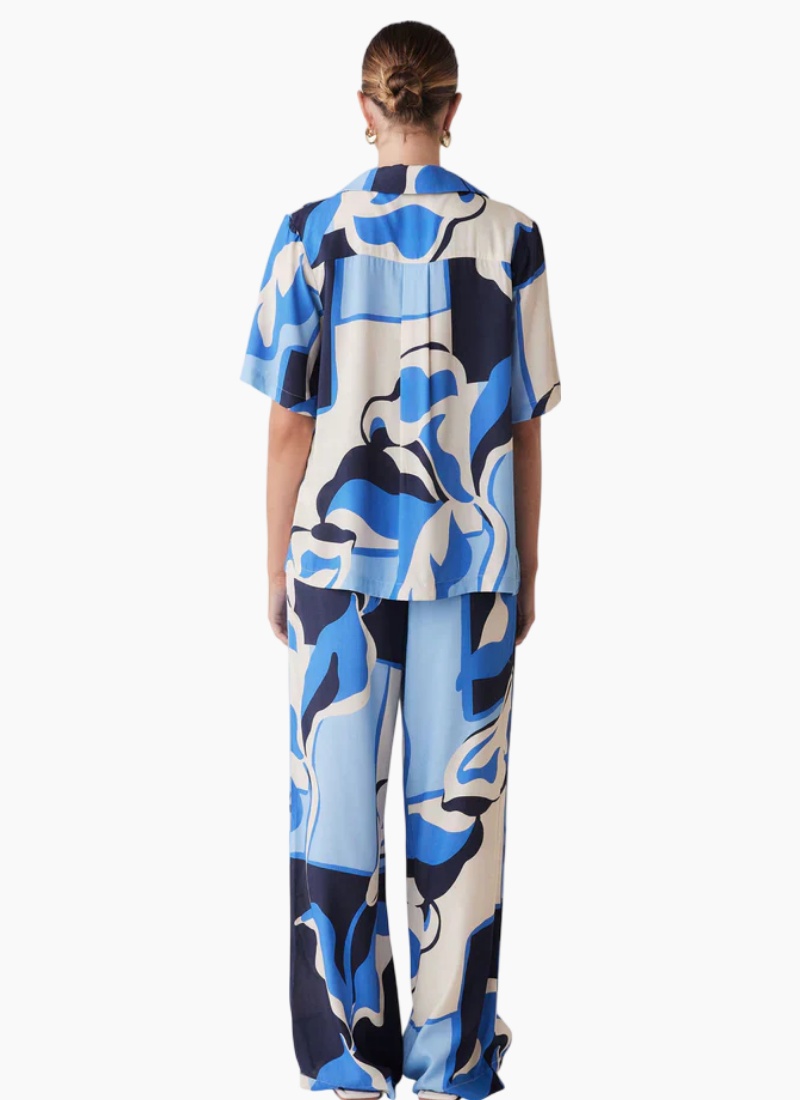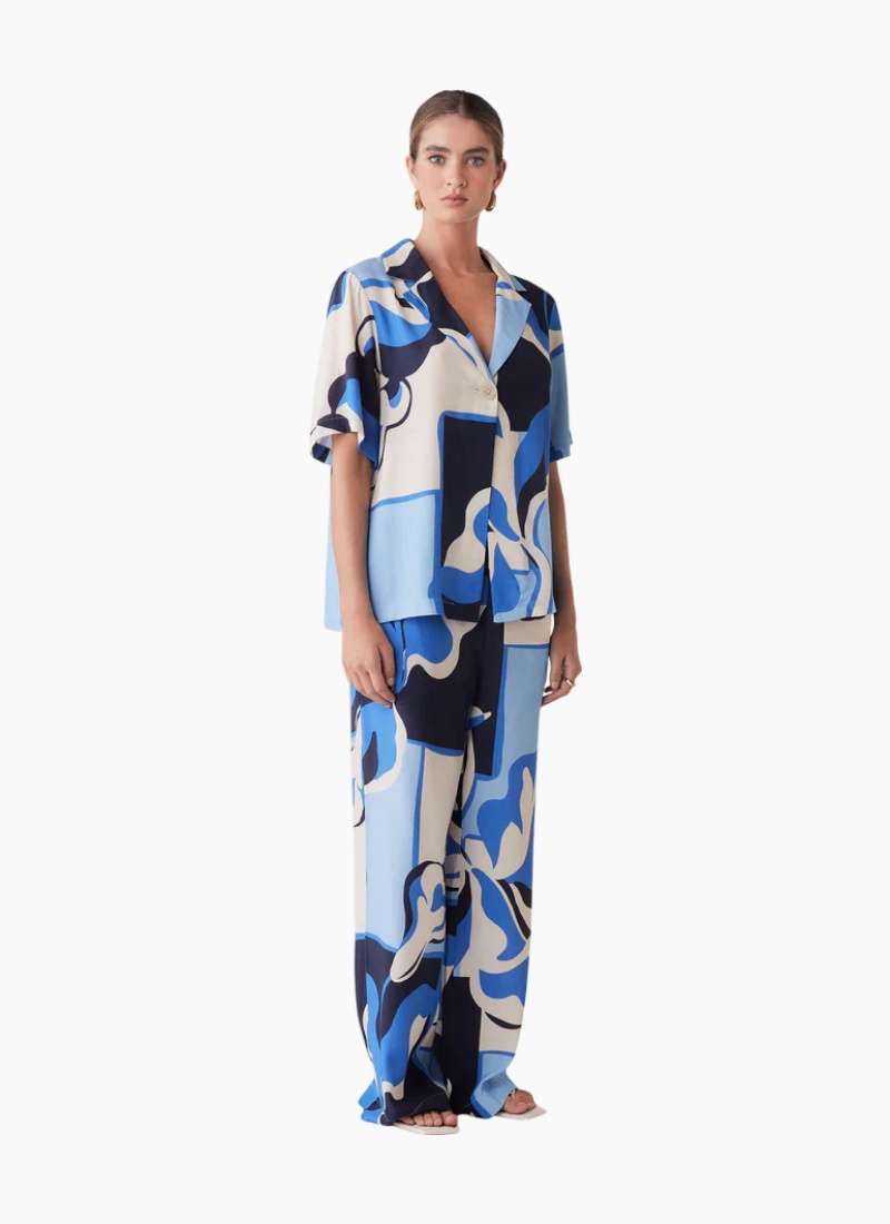 Introducing the Esmaee Daybreak Shirt from Esmaee. A relaxed, collared short-sleeve shirt in a bold abstract blue and cream print that brings effortless polish to daytime dressing.