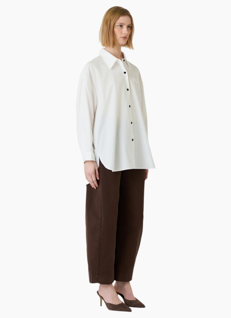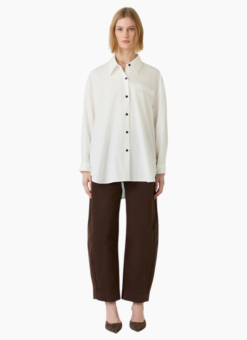 - Classic pointed collar and full button-through front with contrasting dark buttons for subtle definition
