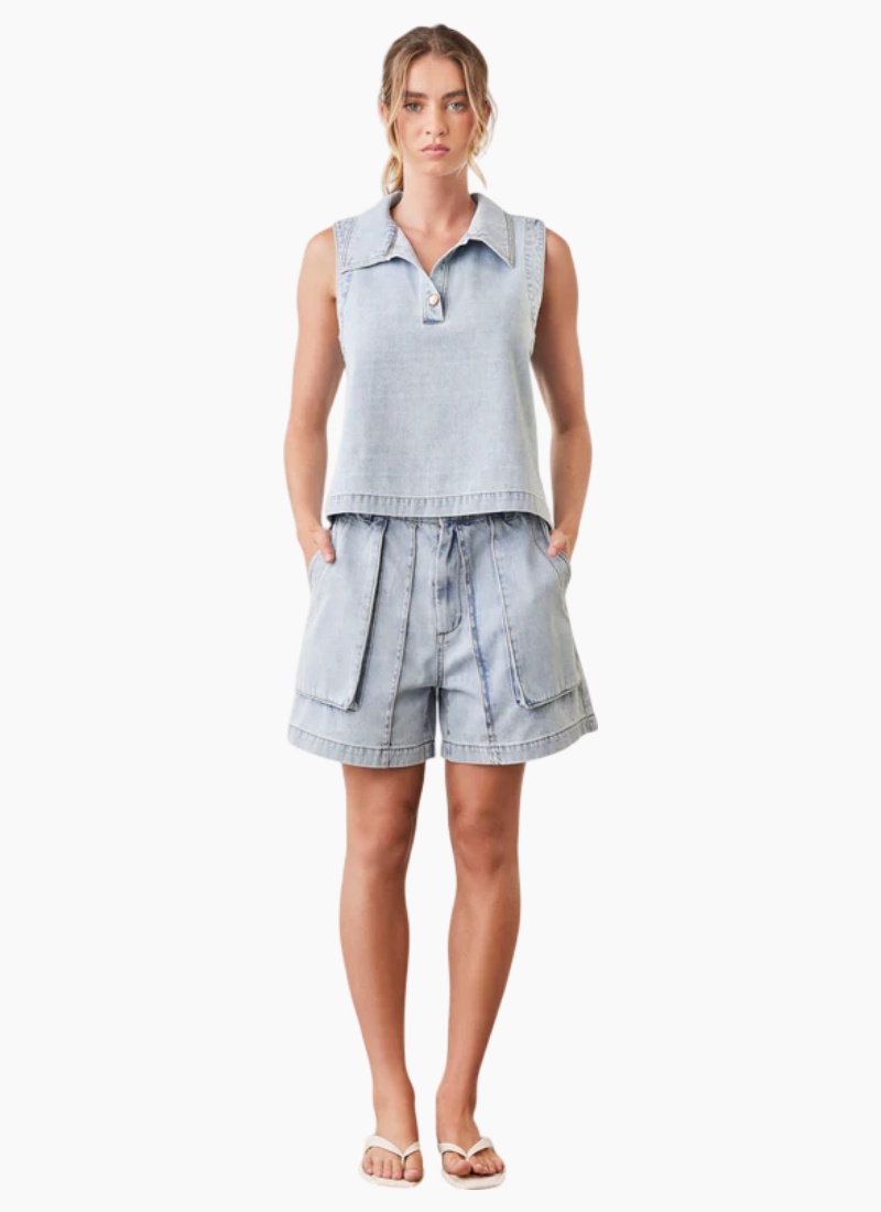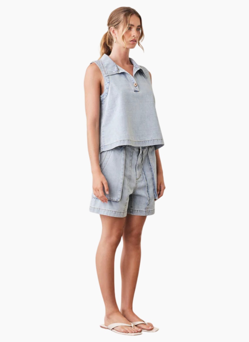 Introducing the Riptide Denim Top from Esmaee. A breezy, collared denim top in a soft light-blue wash that elevates relaxed summer dressing.