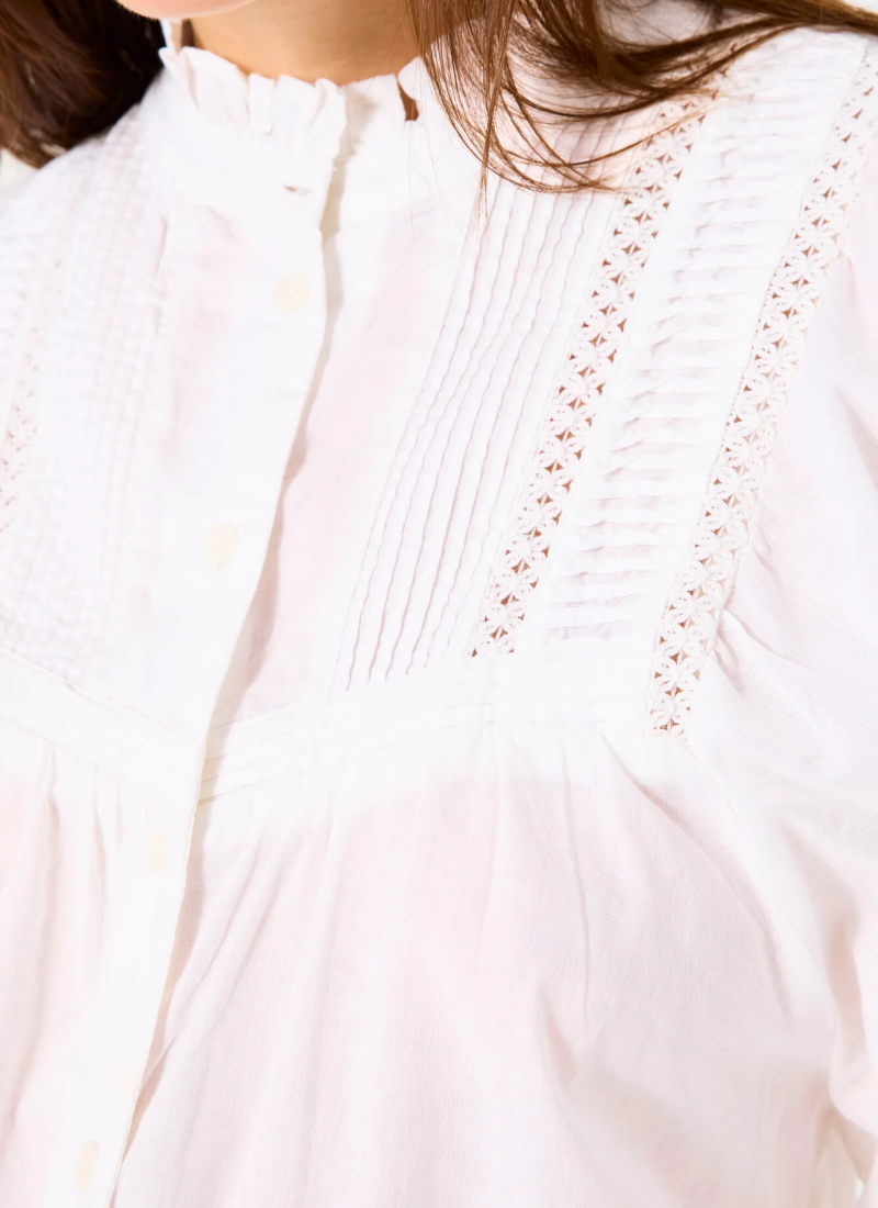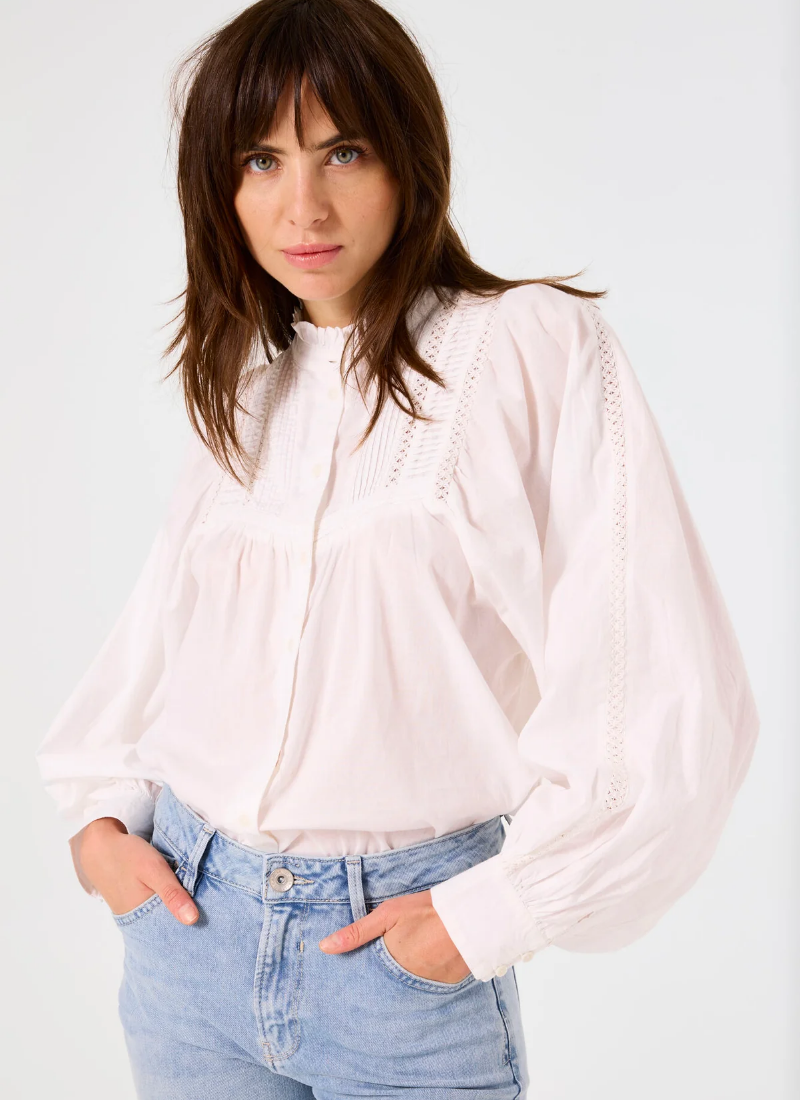 The Garcia Pamela Shirt in white brings a fresh twist to your workwear with its stunning sleeves that steal the spotlight. Its classic button-down style pairs effortlessly with your office essentials while adding a playful flair to your look. Perfect for those who want to keep things professional but far from boring