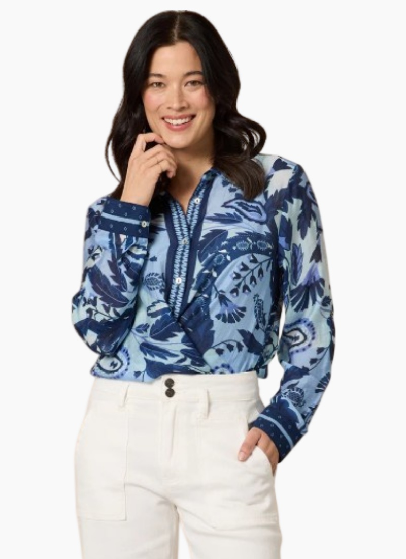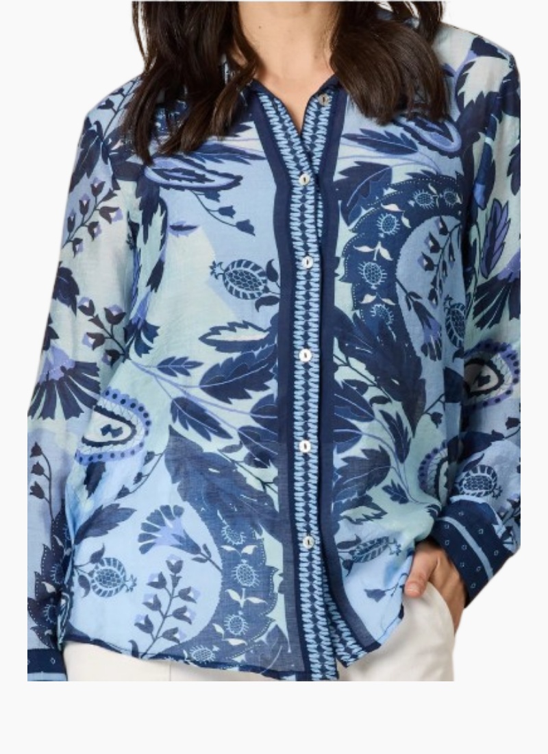 - Part of the Tops collection — Shirts & Blouses, rendered in a vibrant blue multi paisley print