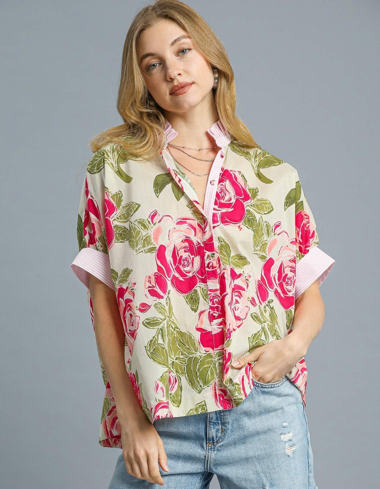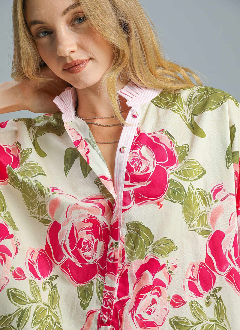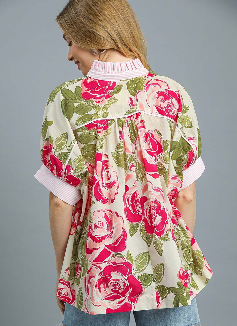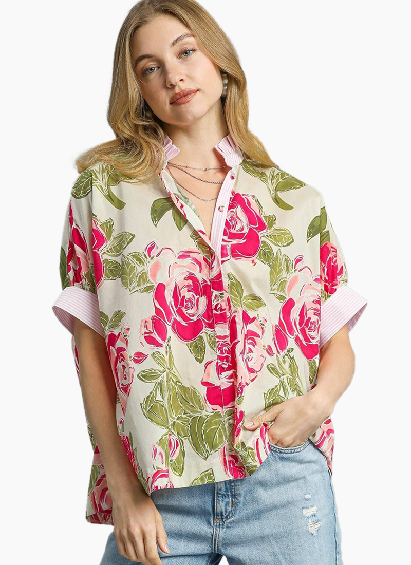 Rose print button up shirt with short sleeves and front button closure.