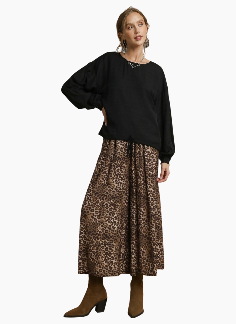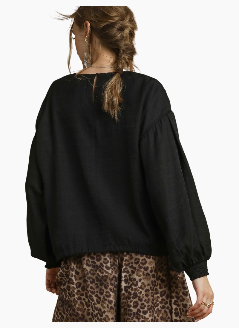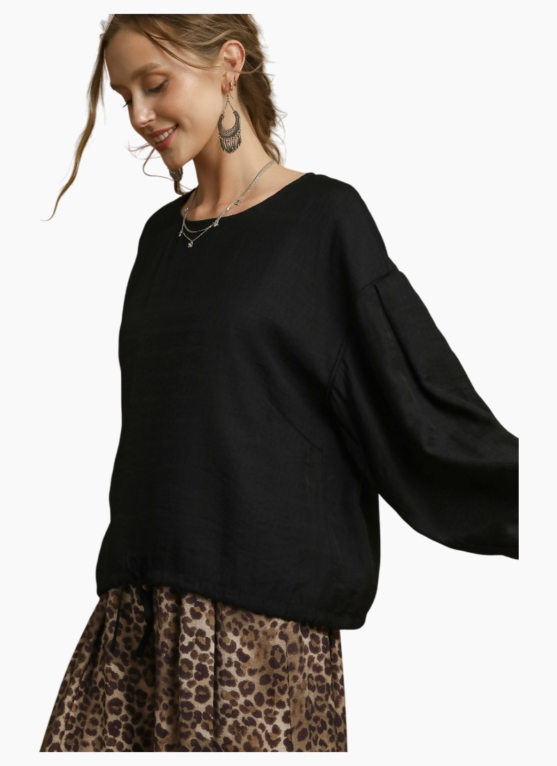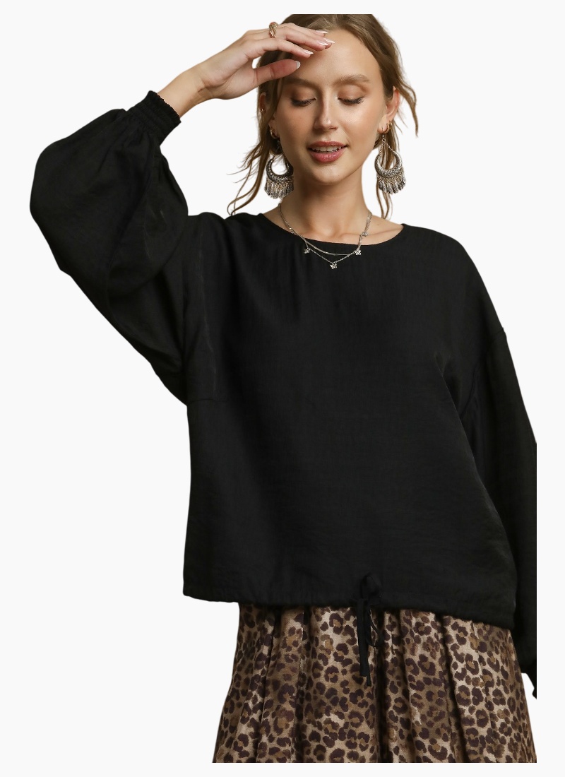 Round Neck Long Sleeve Drawstring Blouse