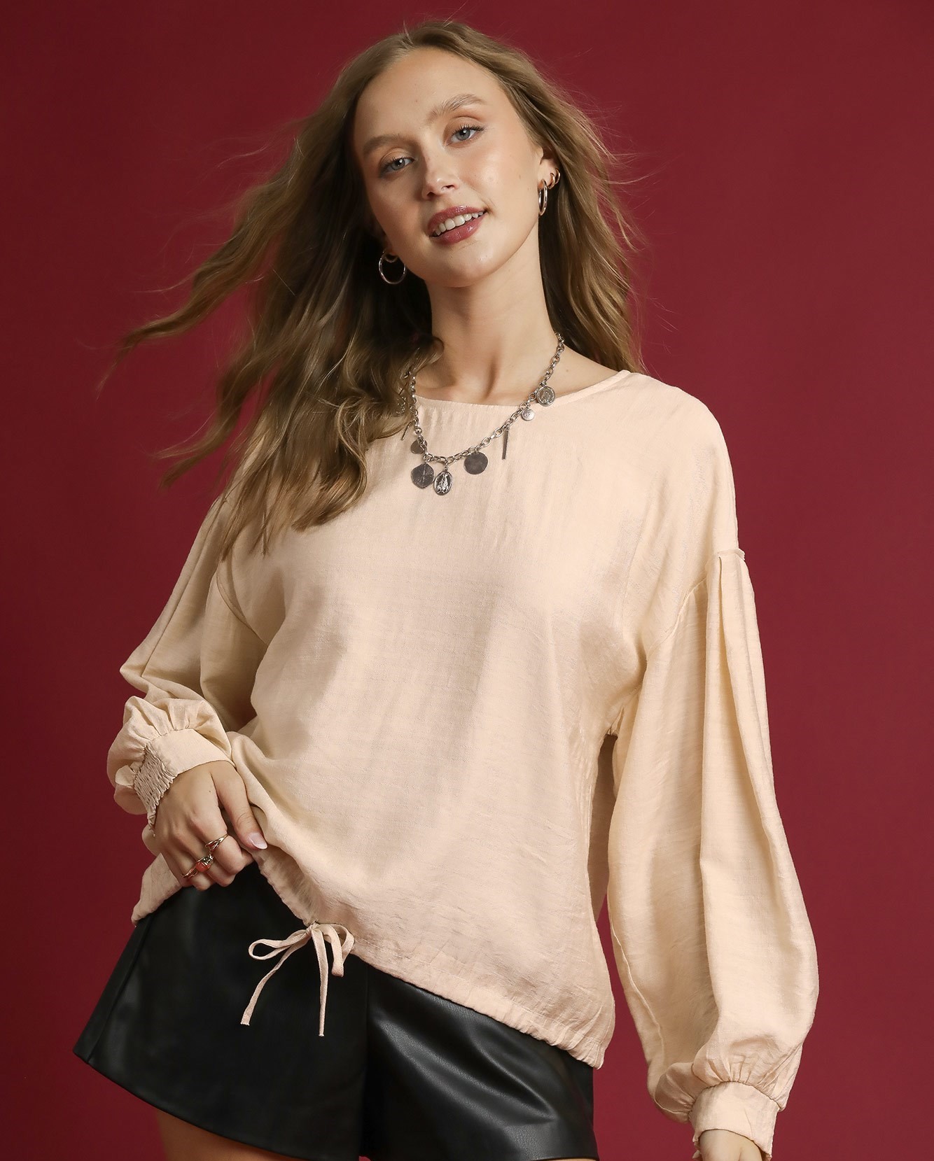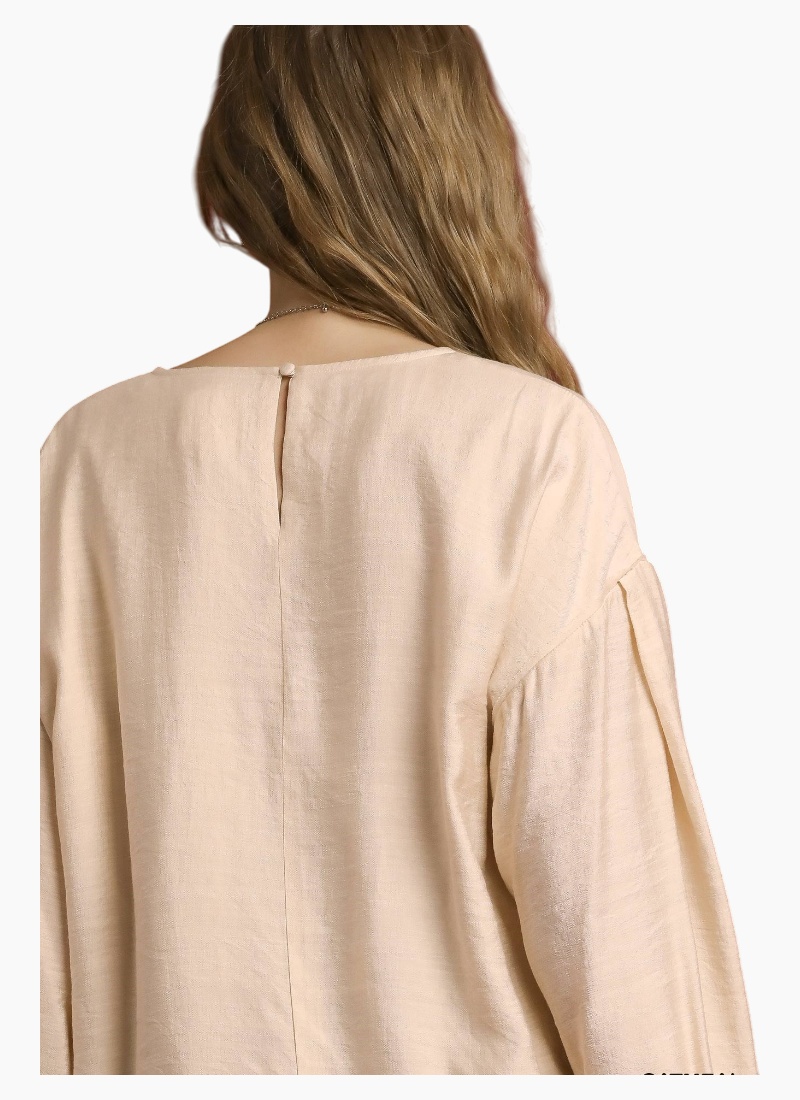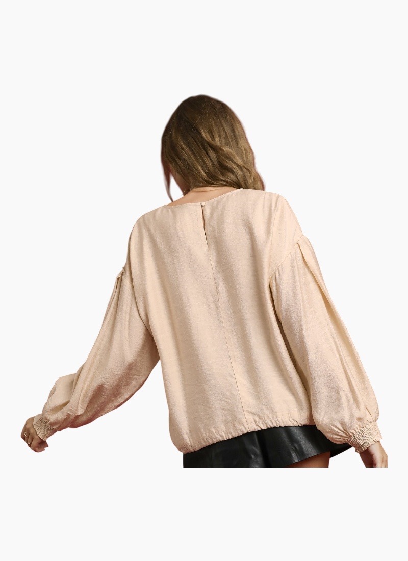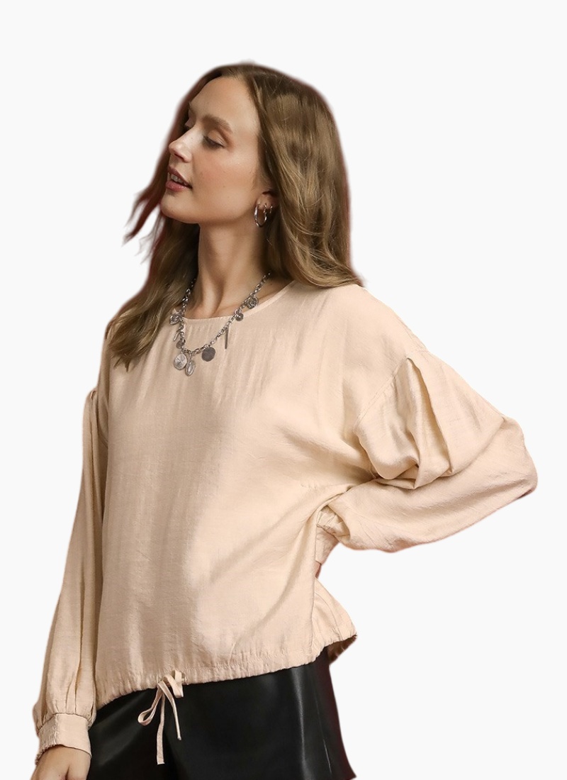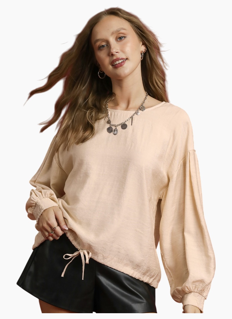 Round Neck Long Sleeve Drawstring Blouse