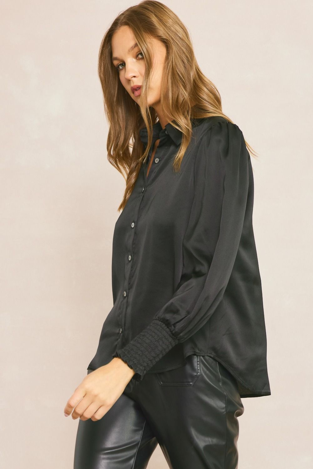 A chic point collar tops this satin button-up shirt finished with smocking at wrists.