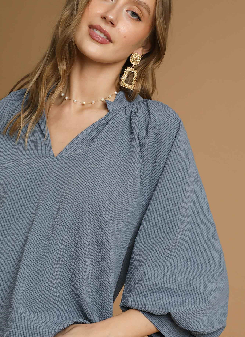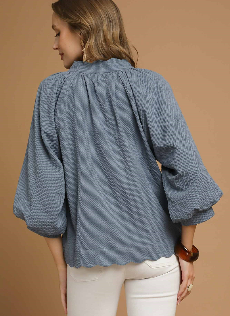 Textured scallop hem blouse with V neckline & 3/4 sleeves