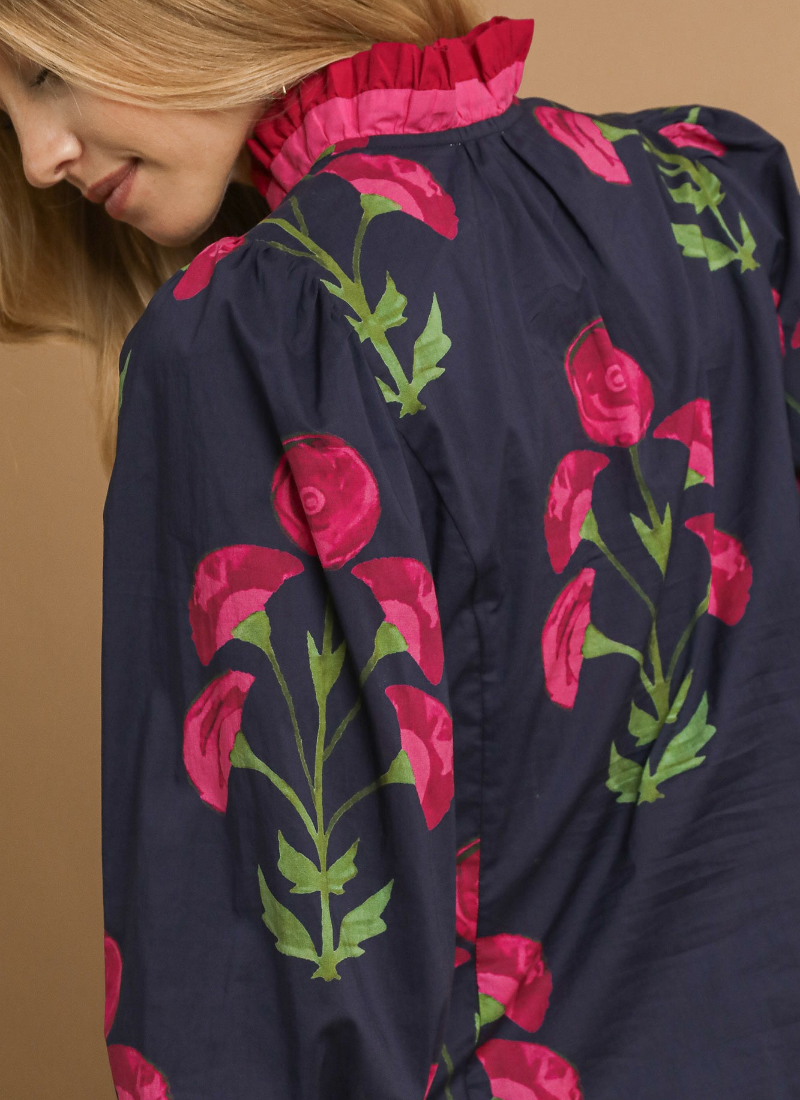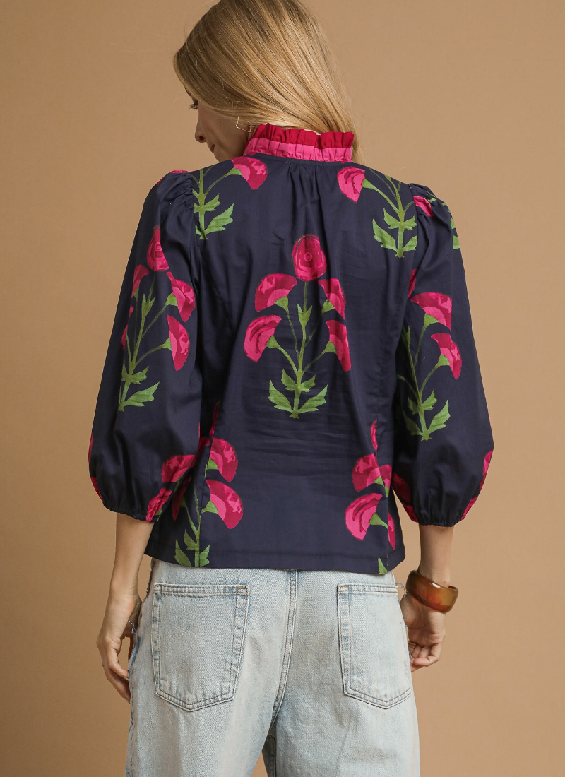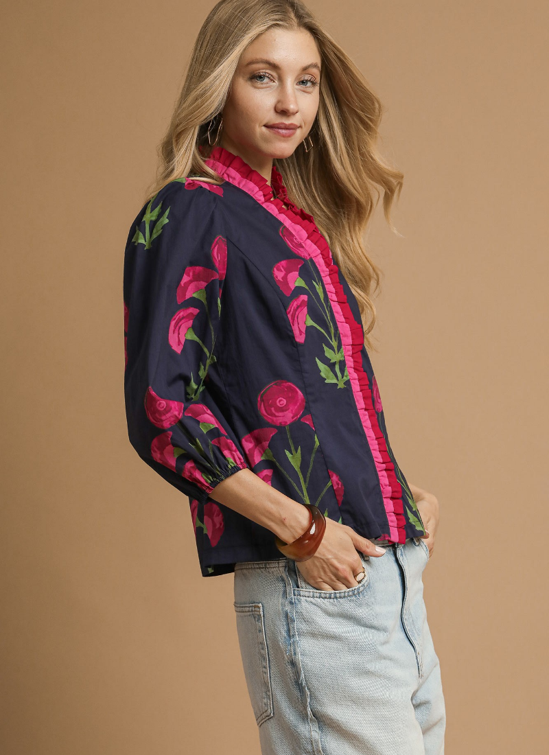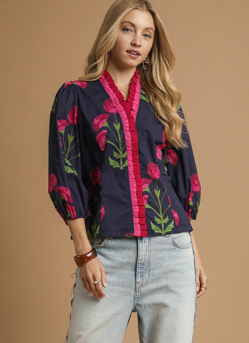 Floral print ruffle top with 3/4 puff sleeves & split V neckline