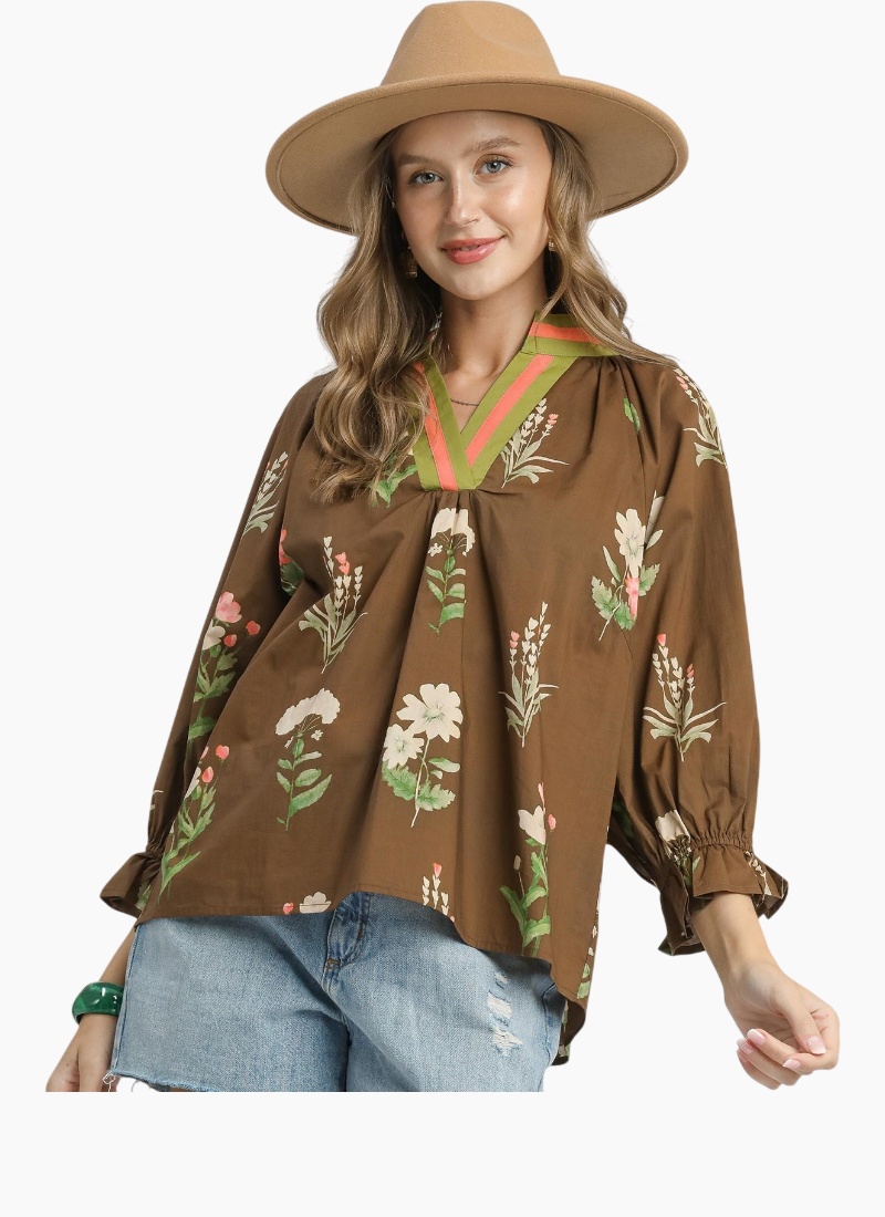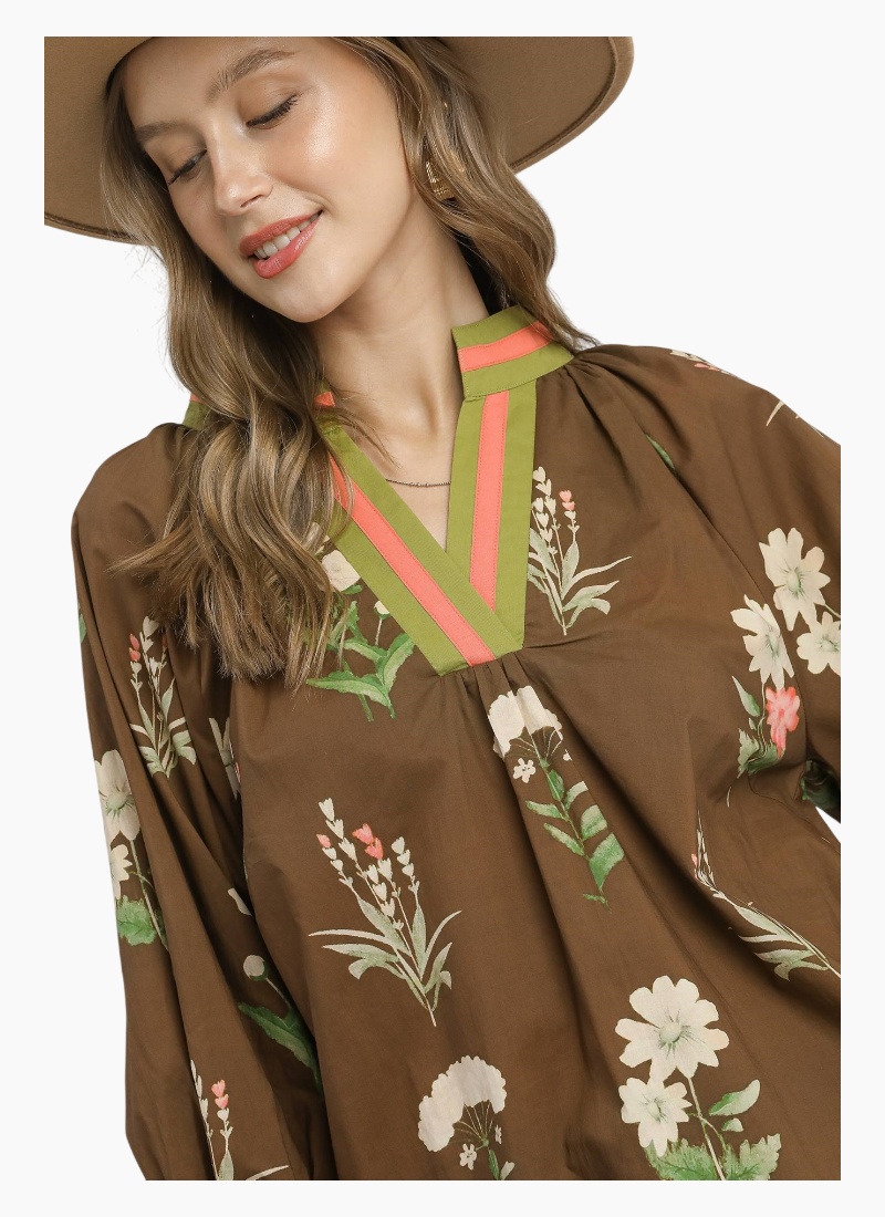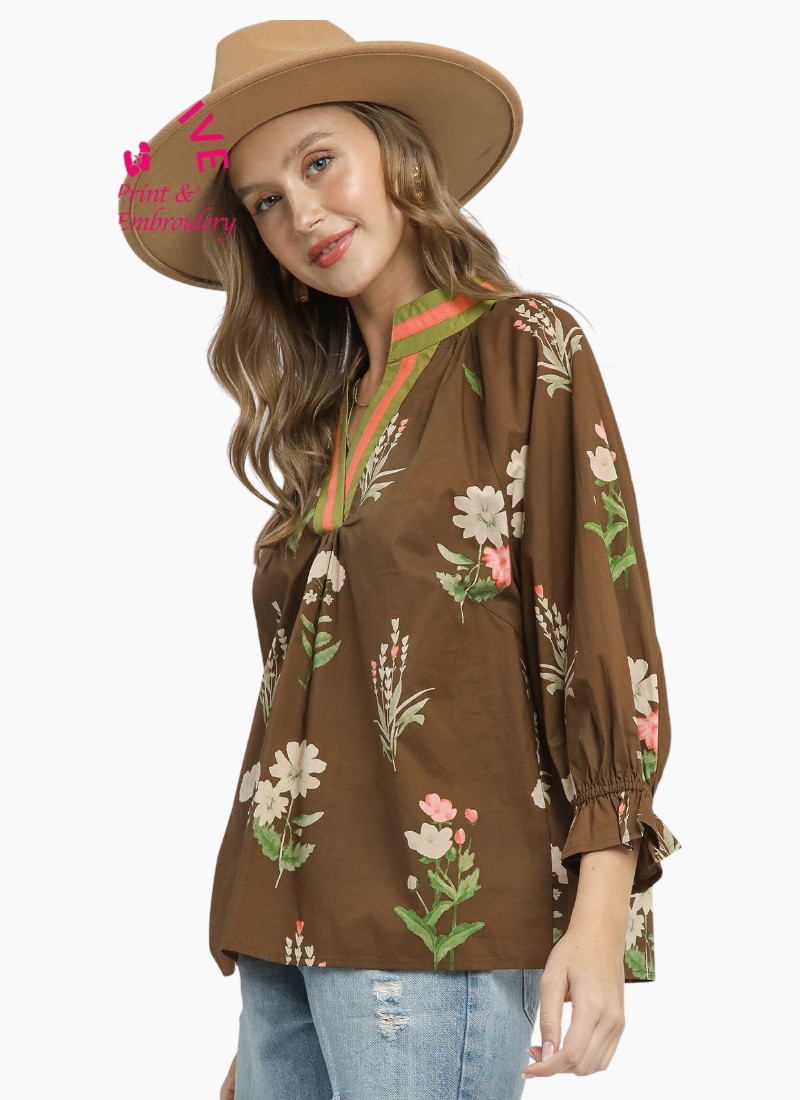 Floral contrast trim blouse with contrast binding