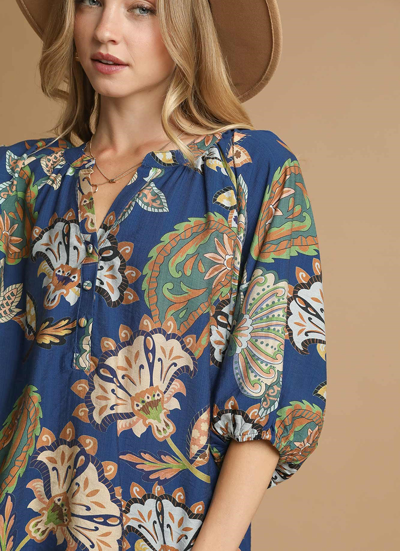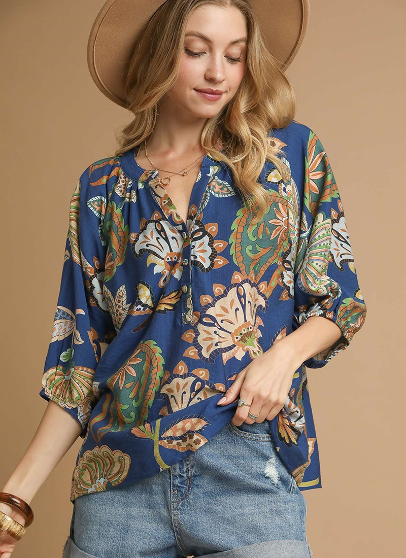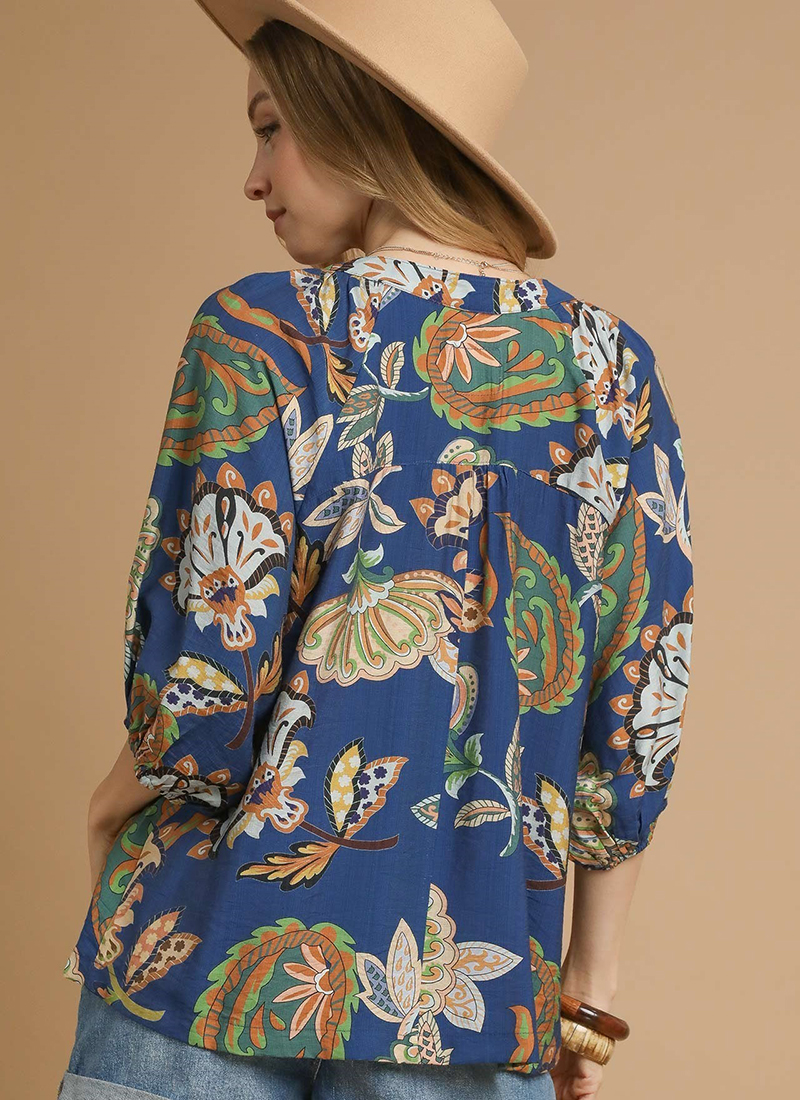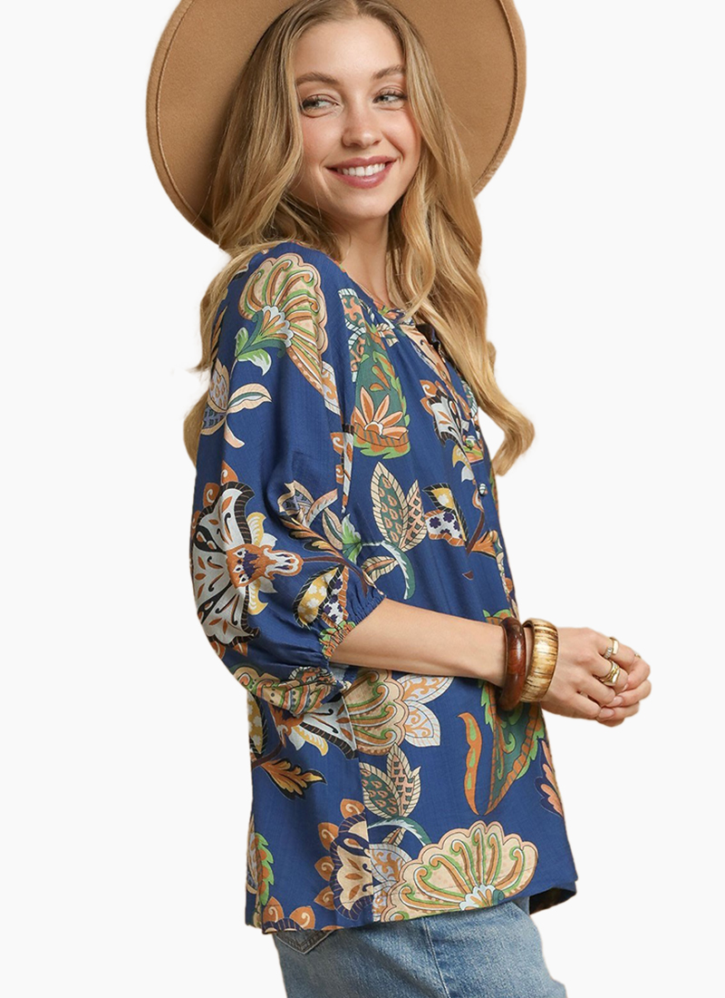 Paisley puff sleeve blouse with 3/4 sleeves and mid button detail