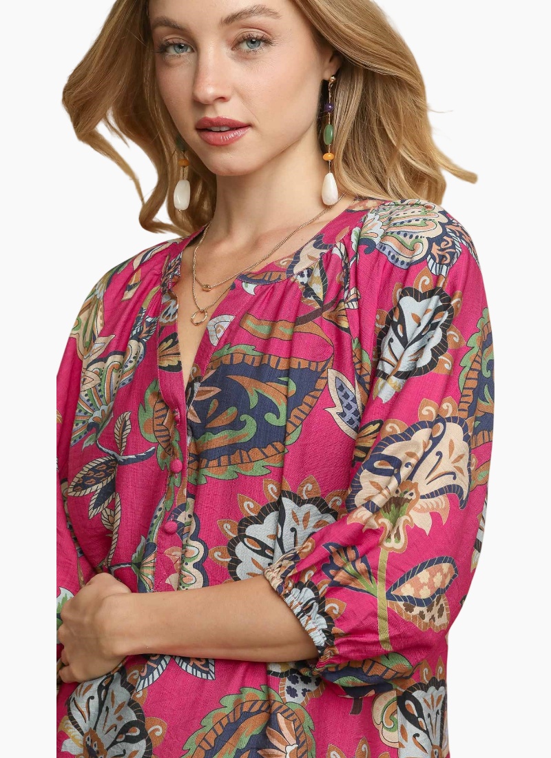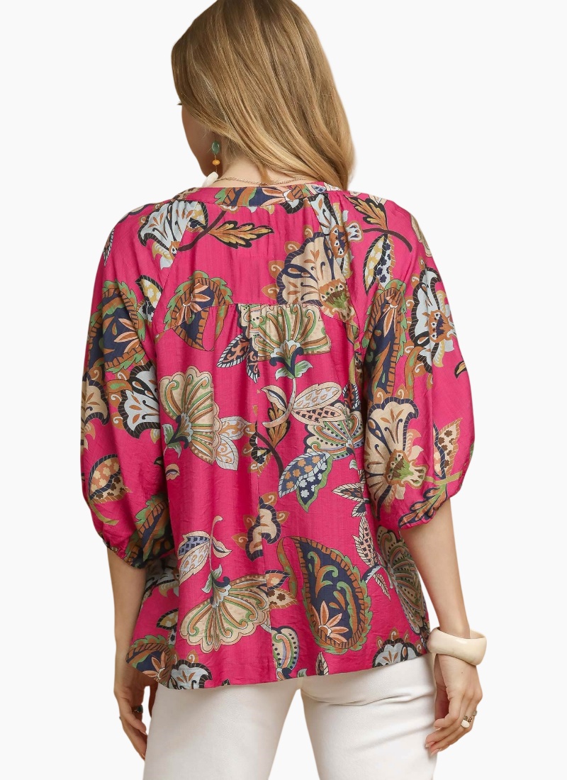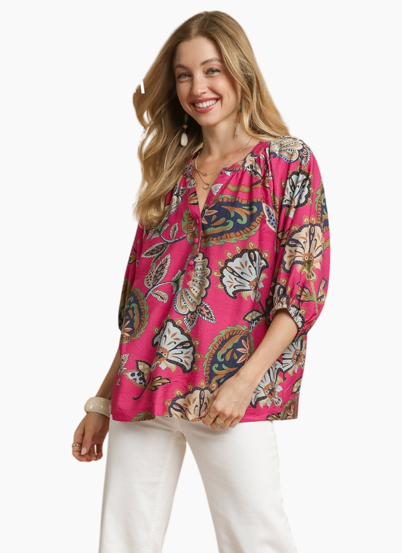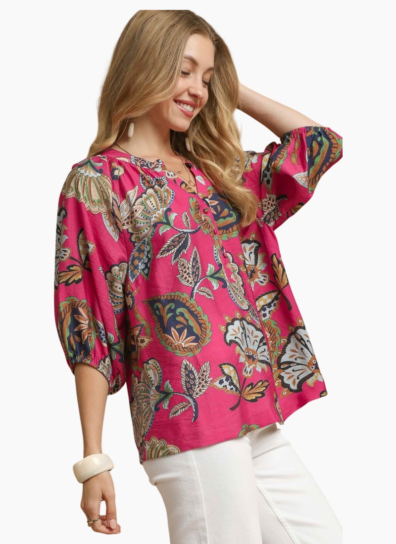 Paisley puff sleeve blouse with 3/4 sleeves and mid button detail