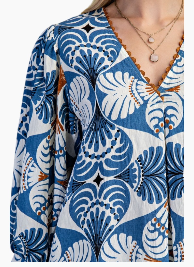 Printed V-Neck Blouse with 3/4 Length Sleeves and Ric-Rac Trim Details