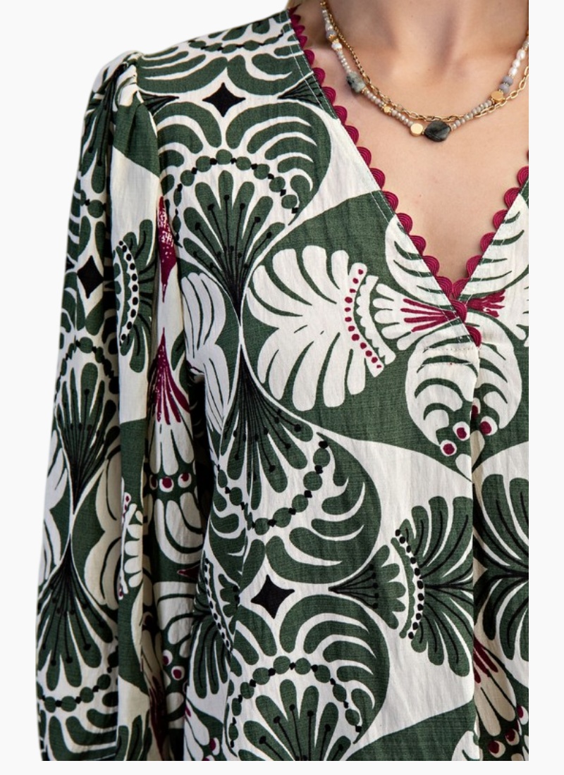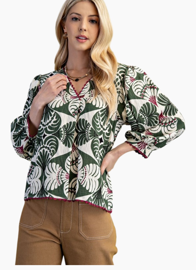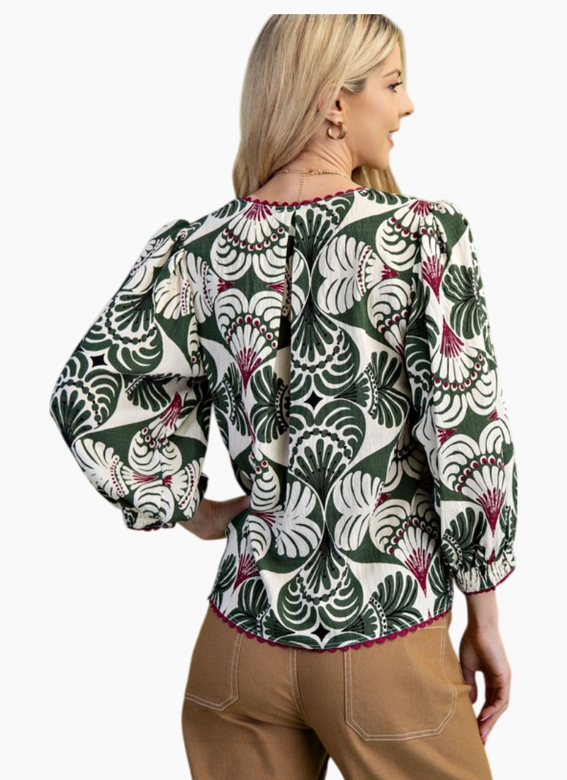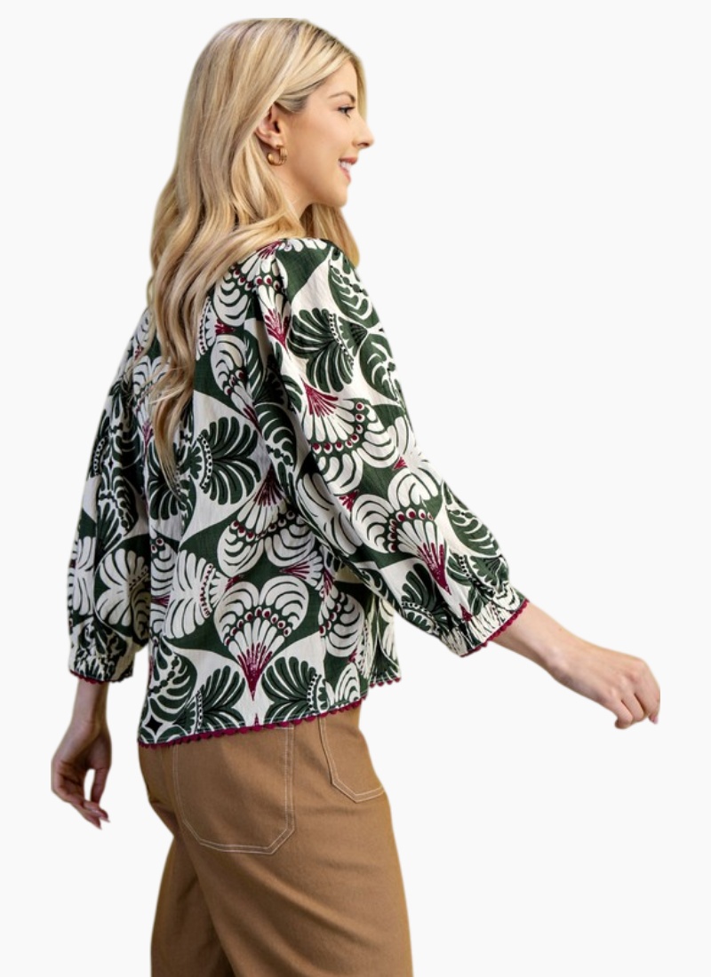 Printed V-Neck Blouse with 3/4 Length Sleeves and Ric-Rac Trim Details