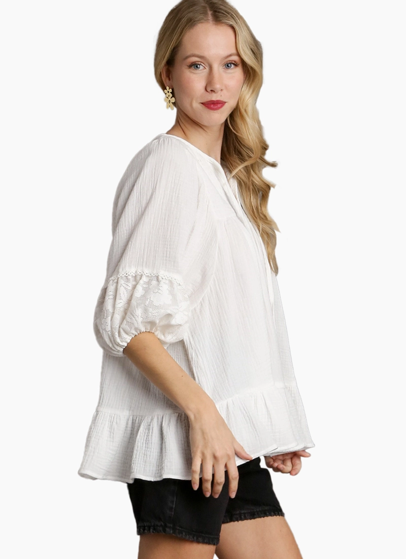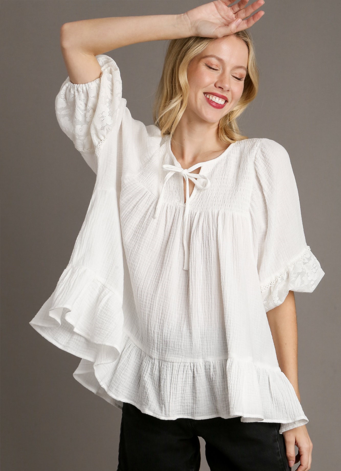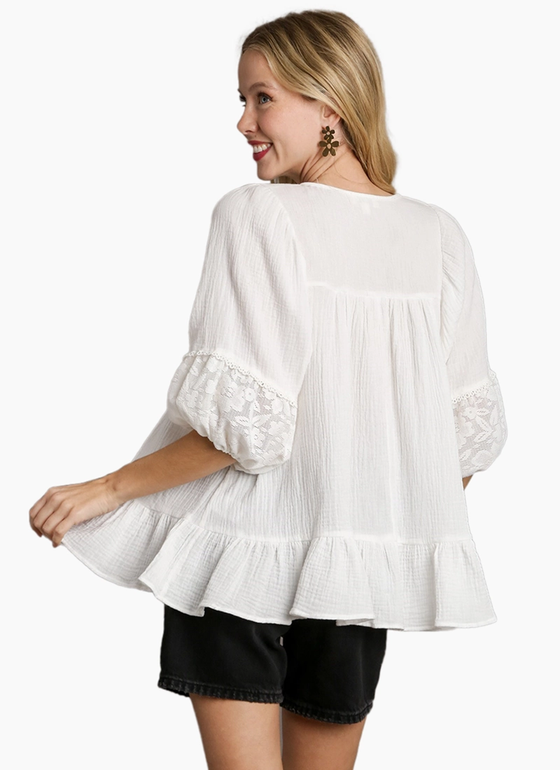 Cotton gauze baby doll 3/4 sleeve top with lace detail & front tie.
