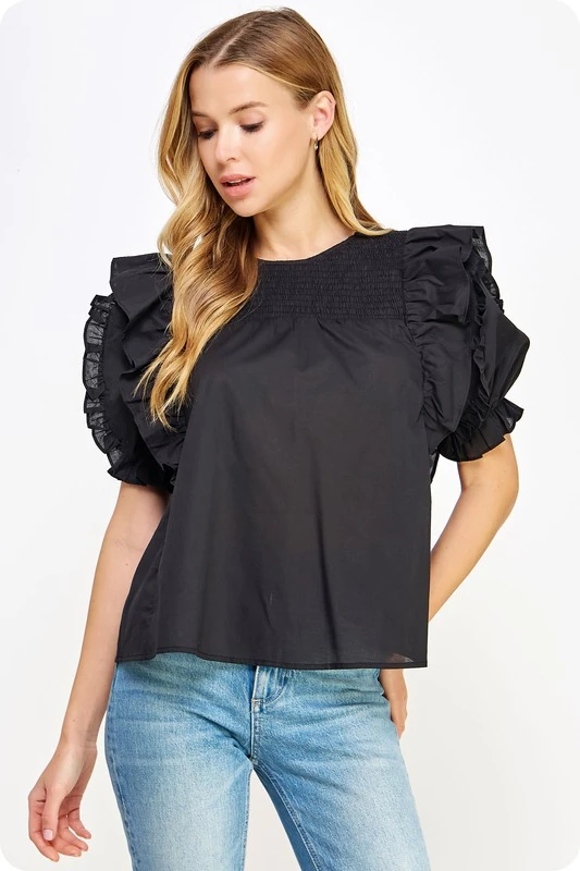 Sweet smocking shapes this puff-sleeve cotton blouse accented with crisp ruffles.