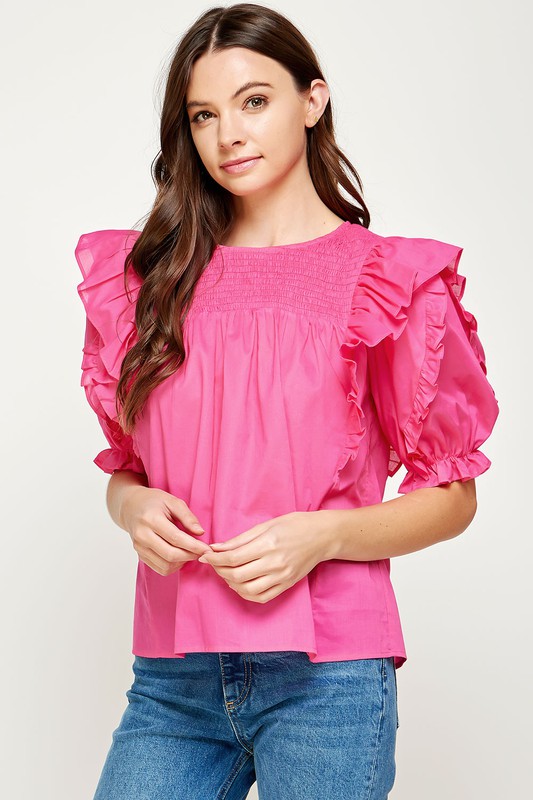 Sweet smocking shapes this puff-sleeve cotton blouse accented with crisp ruffles.