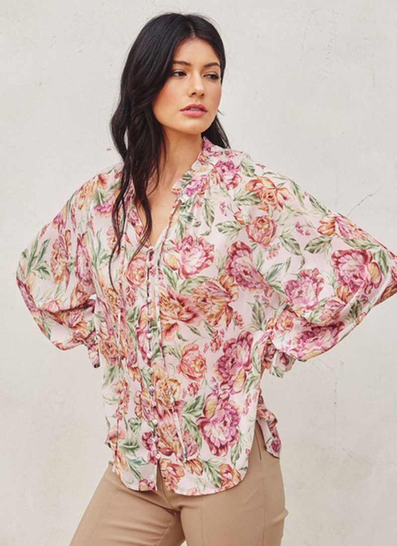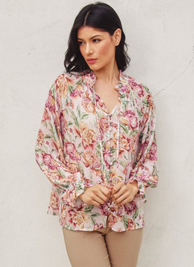Semi-sheer floral print blouse with slim tie detail at a ruffled V neckline