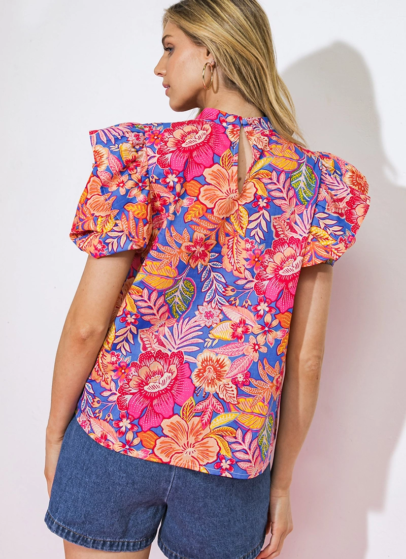 A printed woven top featuring high neckline, short puff sleeve with ruffle.