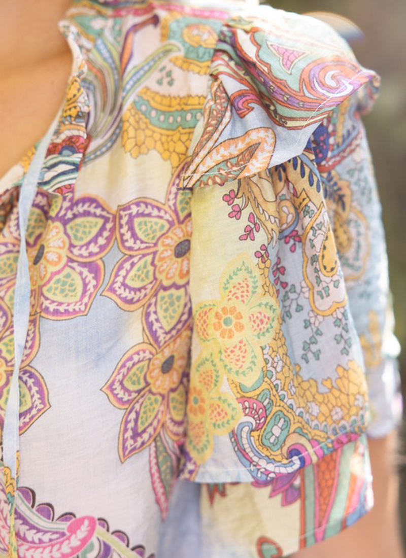 Mixed paisley print top with V neckline & double ruffle short sleeves