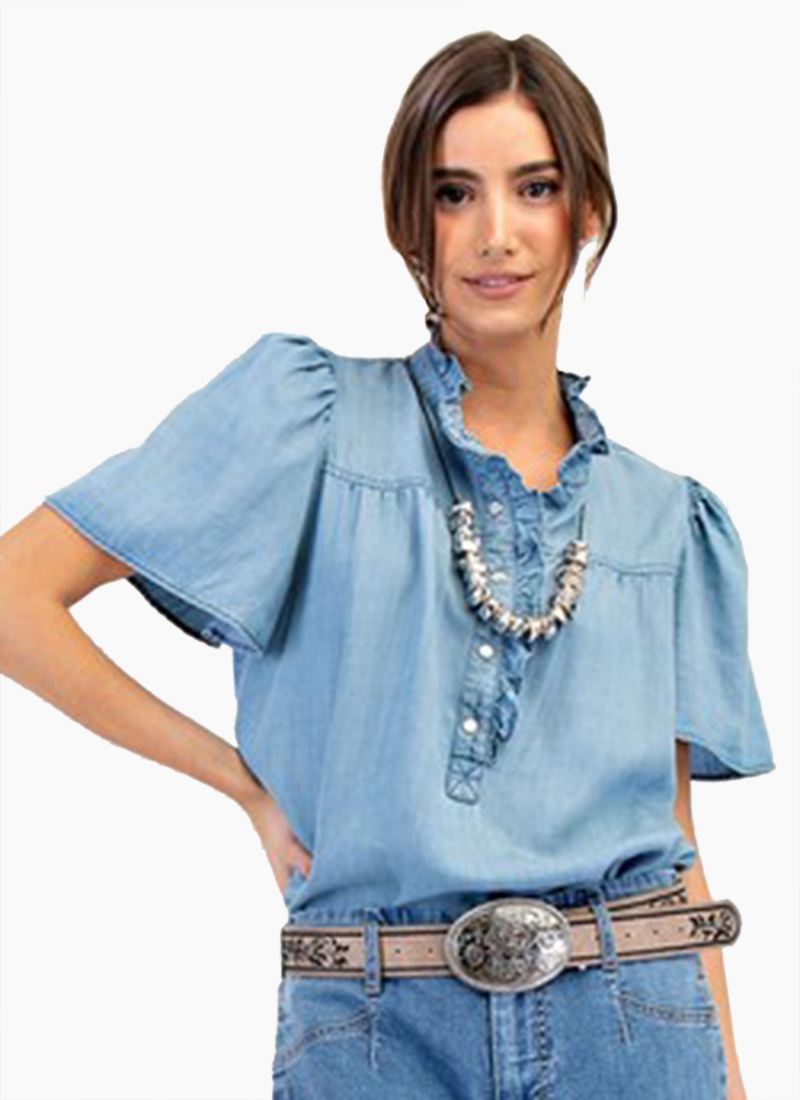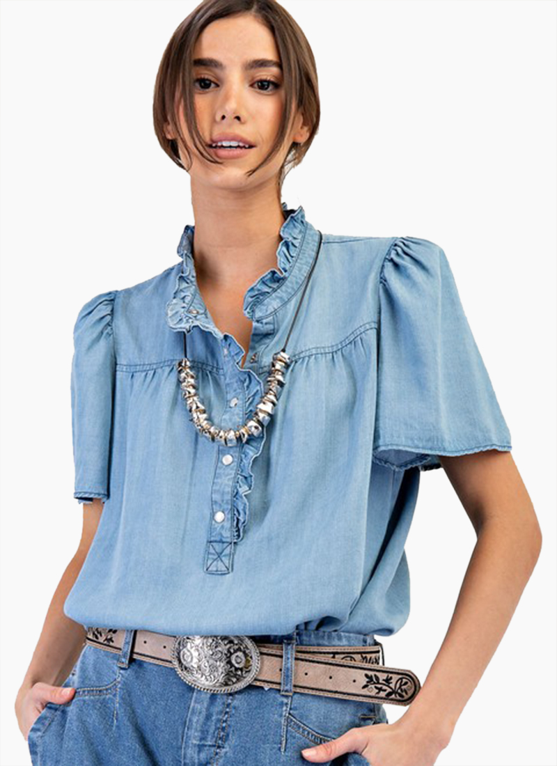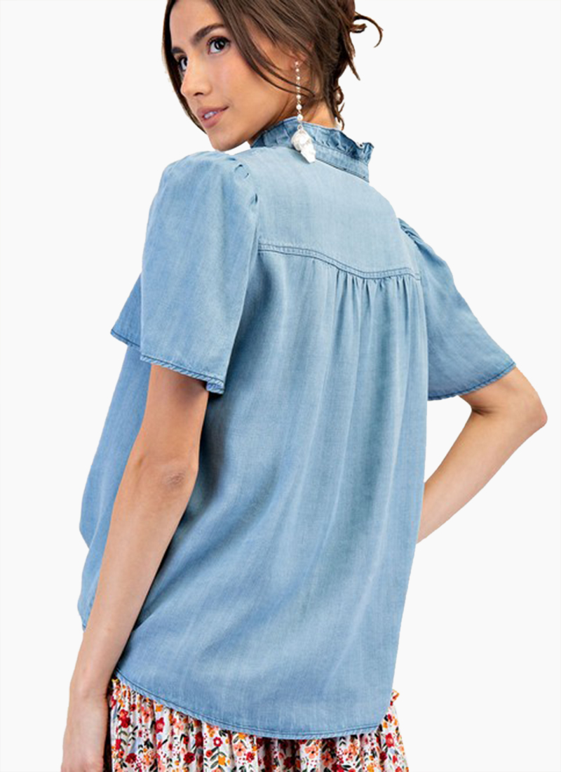 Washed chambray button down shirt with front snap button closure and ruffle detail.