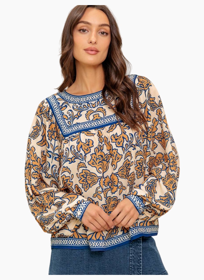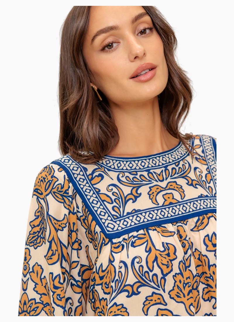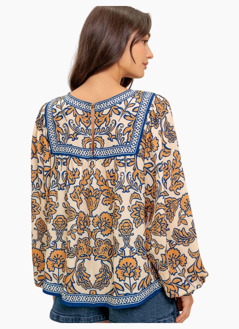 Printed blouse featuring a round neckline yoke, long sleeve and back neck button closure
