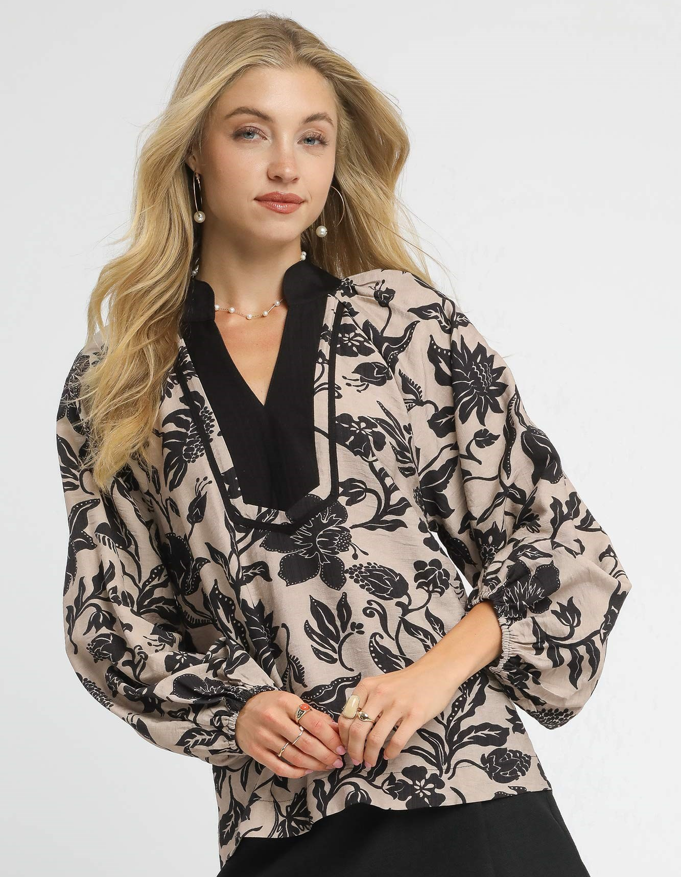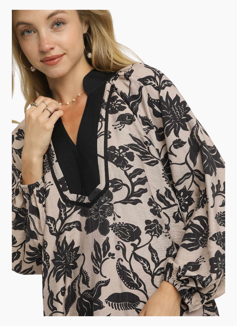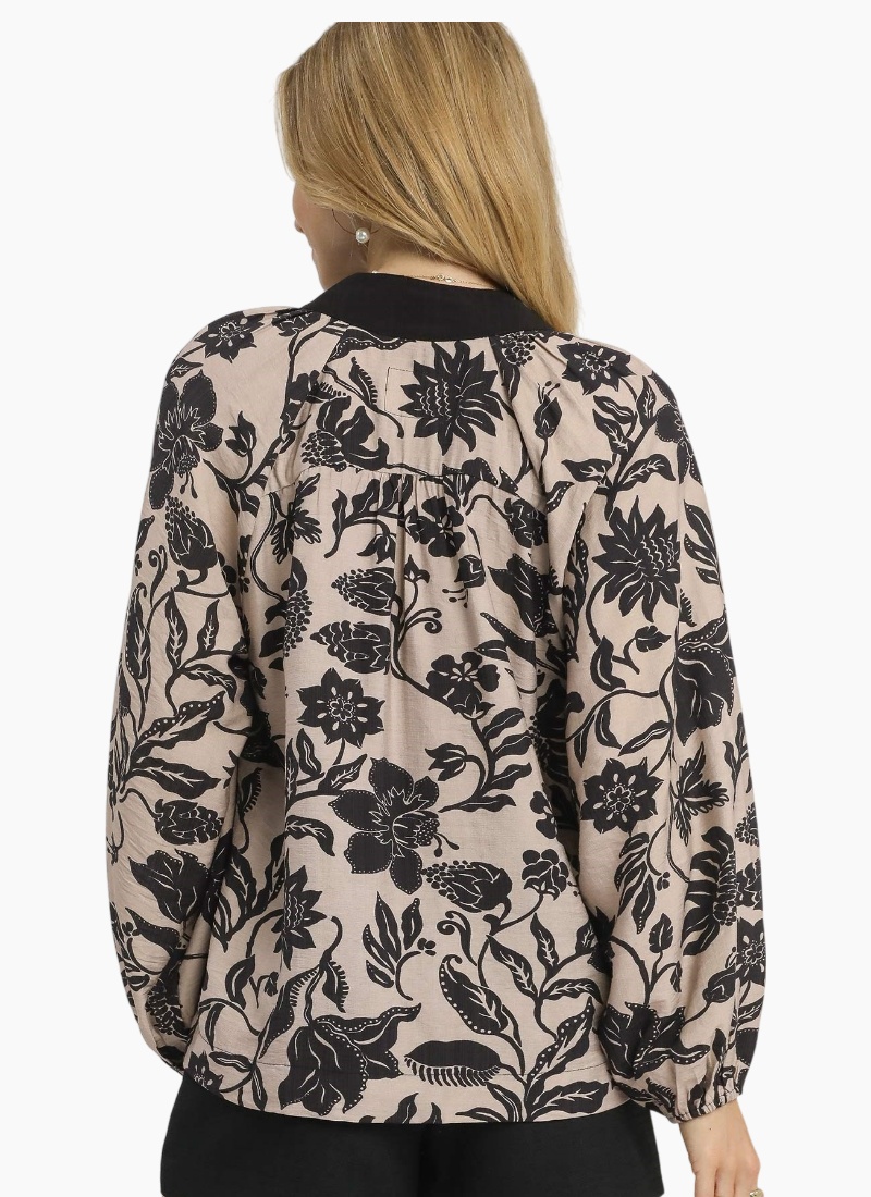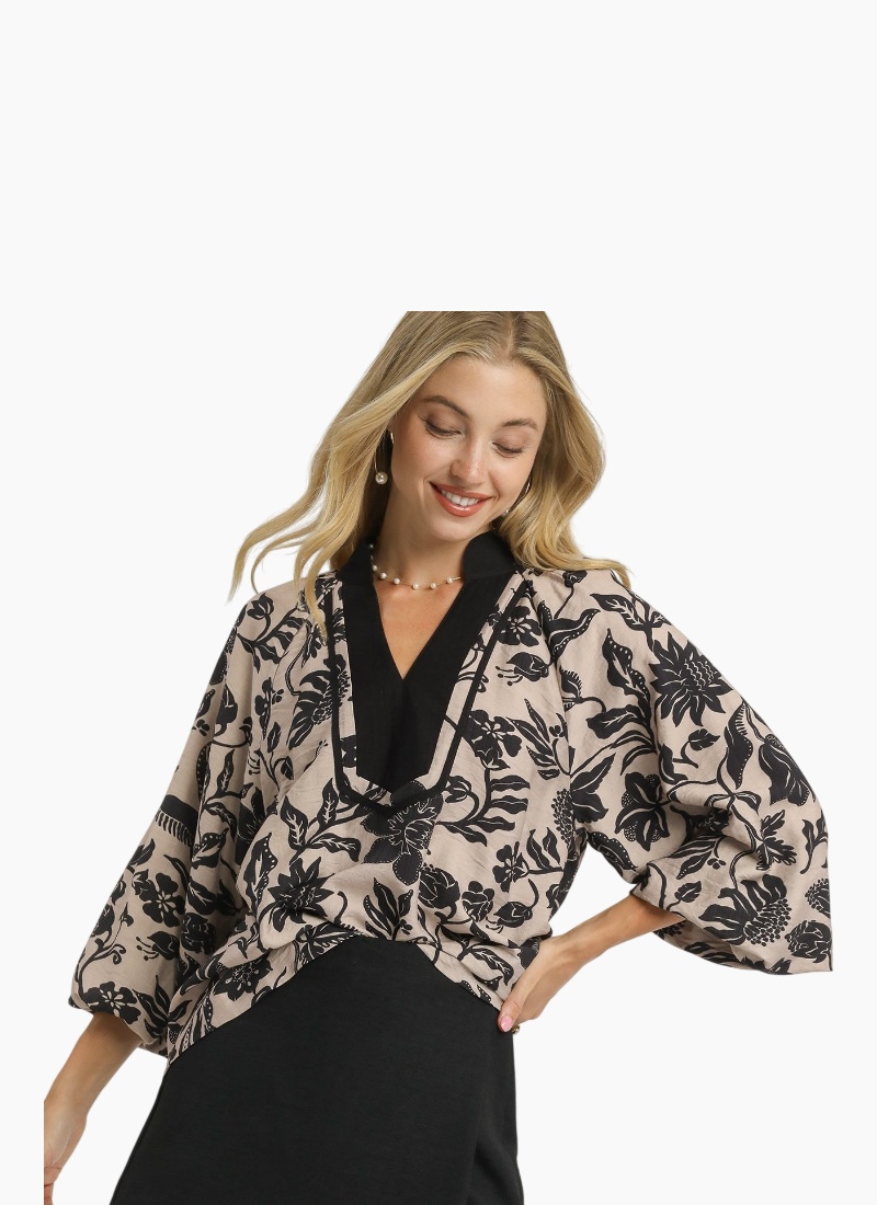 Two tone floral print top with contrast placket