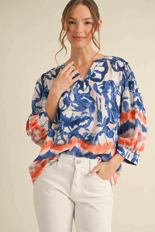 Abstract print top with slit neck, three quarter bubble sleeves, band cuffs featuring embroidery.