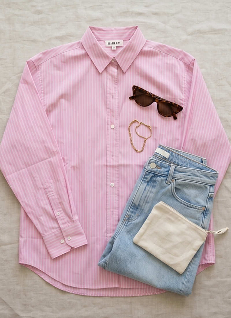 Introducing the Ashley Shirt - Pink/White Stripe from HARLEM. A timeless button-up that brings a fresh, feminine touch to your wardrobe.