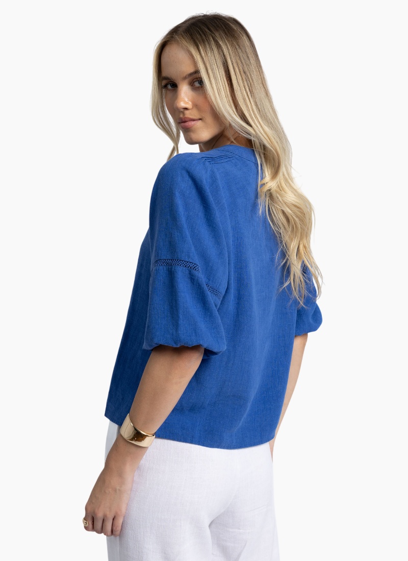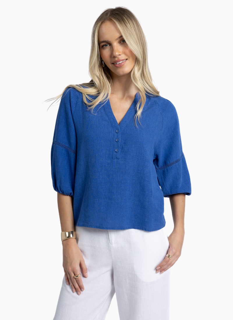 The perfect blend of style and comfort.Crafted from a breathable linen blend, featuring ramie cotton and tencel (an eco-friendly yarn) the Nixie Blouse carries subtle details that elevate her flattering shape. The roomy fit and classic style allows easy pairing with your favourite jeans, shorts or linen pant. • Soft, easy wear summer blouse with trim feature. • Flattering V-neck with self-covered button closure. • Pintuck detailing on shoulders. • Roomy sleeves with trim feature. • Elastic cuff opening allows sleeves to be pushed up or worn down with ease. • Crafted from a breathable, non-sheer linen blend. HS25200