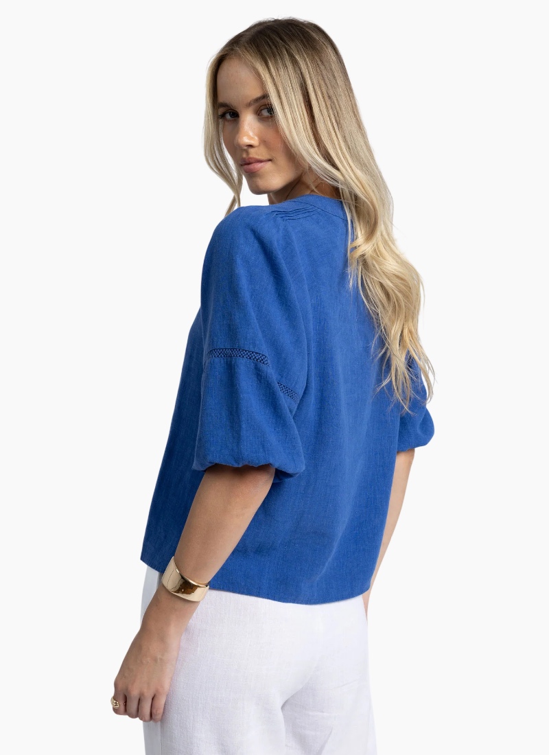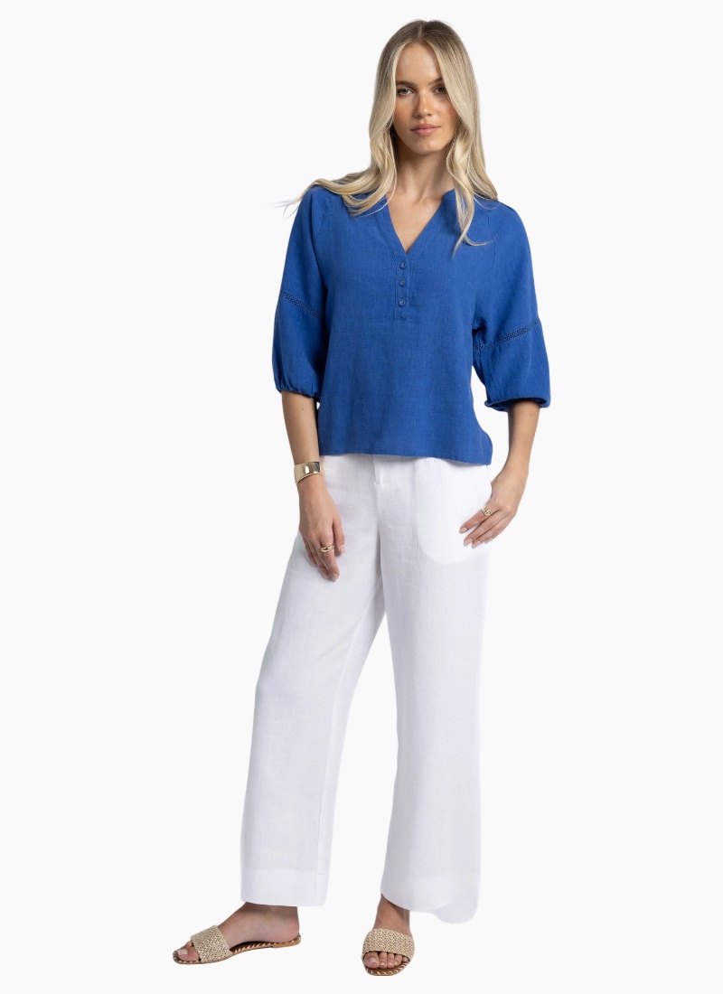 Soft, easy wear summer blouse with trim feature. Flattering V-neck with self-covered button closure. Pintuck detailing on shoulders. Roomy sleeves with trim feature. Elastic cuff opening allows sleeves to be pushed up or worn down with ease. Crafted from a breathable, non-sheer linen blend. Relaxed fit - check your measurements below for fitting guide. The perfect blend of style and comfort. Crafted from a breathable linen blend, featuring ramie cotton and tencel (an eco-friendly yarn) the Nixie Blouse carries subtle details that elevate her flattering shape. We hand measure all our garments to help you choose the best fit. These are the measurements for this garment. Measurements XS S M L XL Chest 99 104 109 116 119 Sleeve Length 49.5 50.3 51.1 51.9 52.7 Total Length 60 61 62 63 64 Model Wears Size: XS Model Measurements (cm): Height:179 Bust:84 Waist:60 Hips:90 Care: We recommend a cold hand wash to extend the life of your garment. Refer to garment care label for more detail.