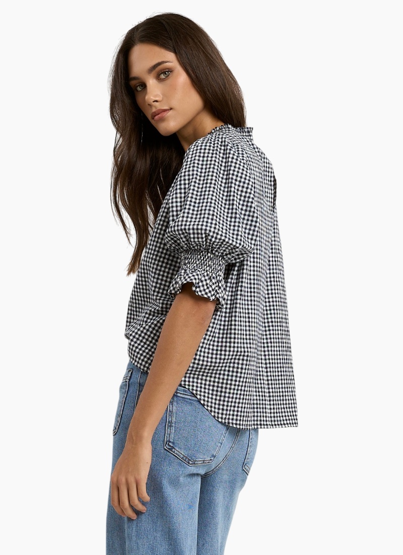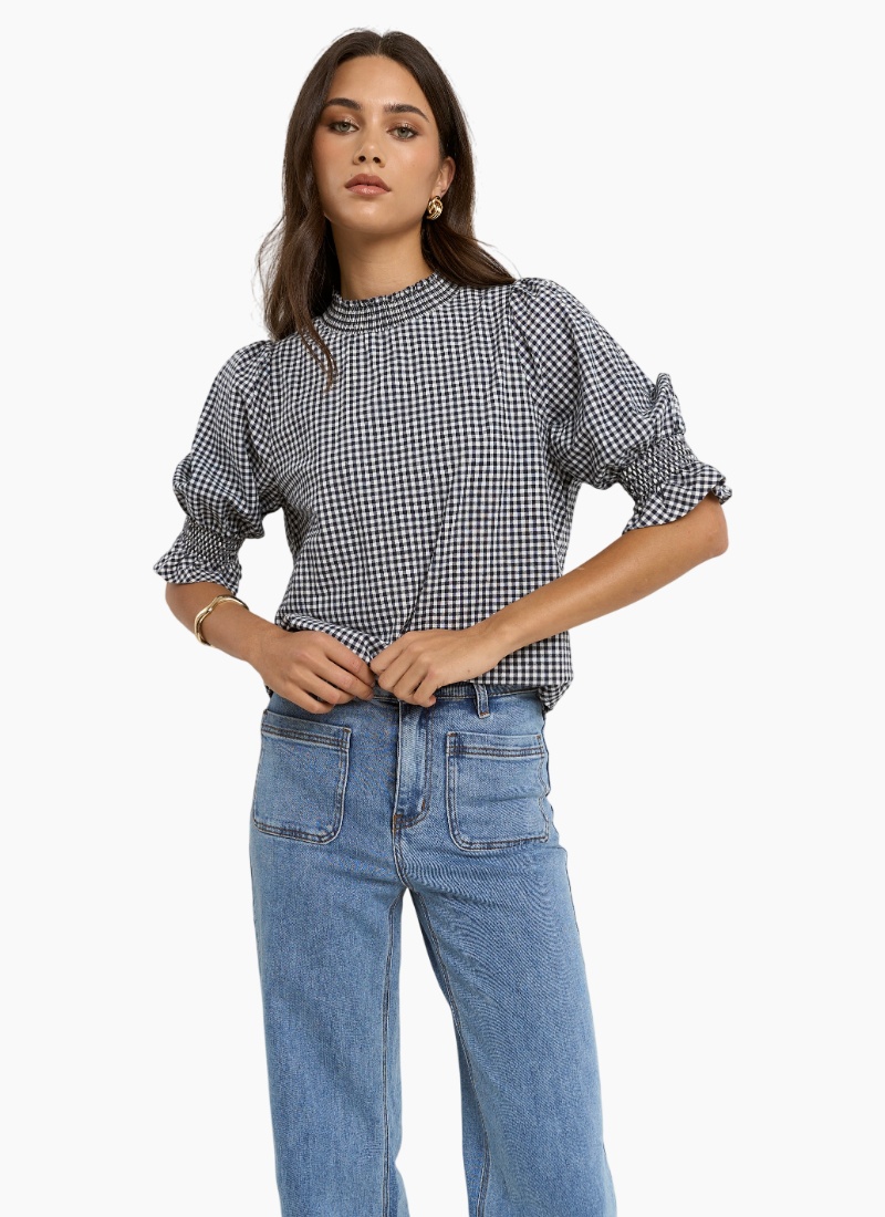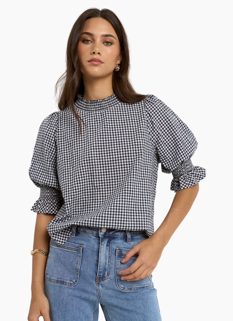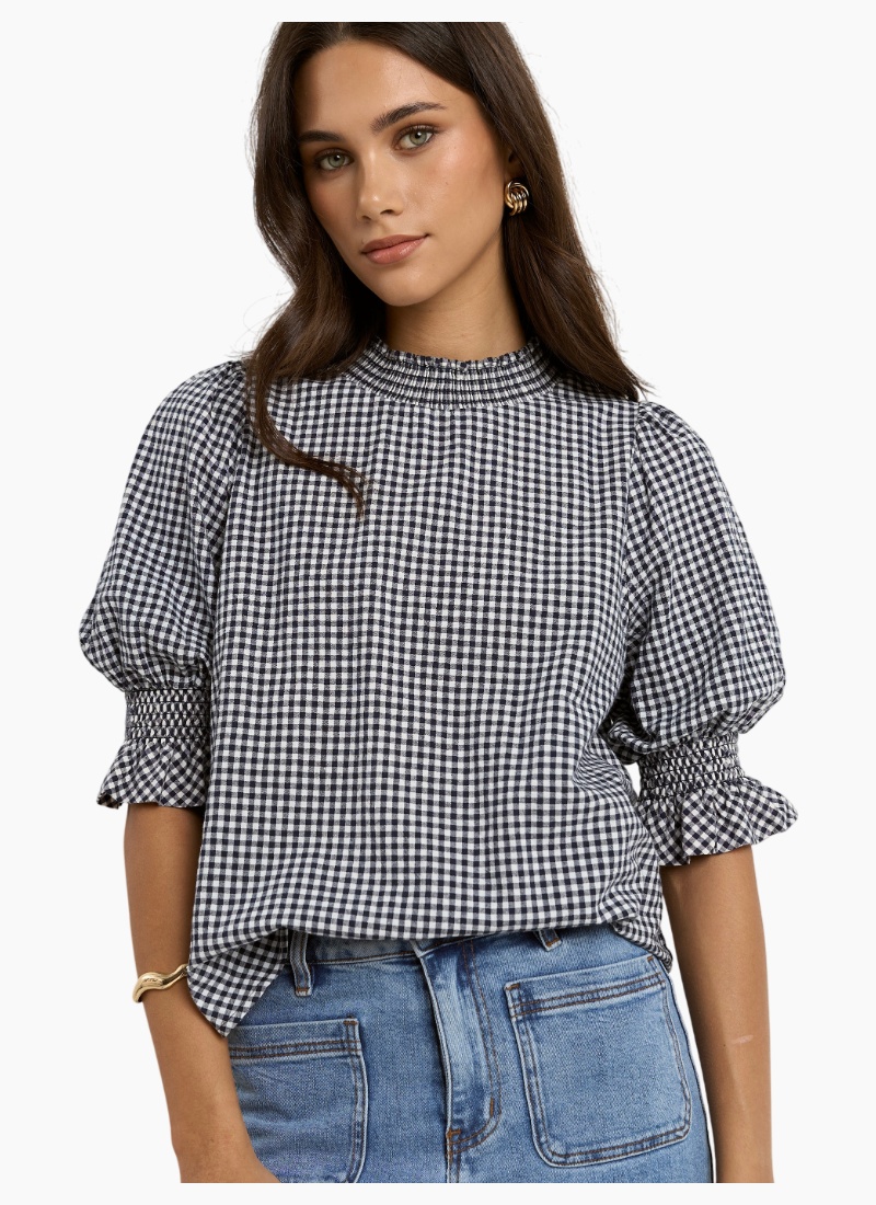 The Affection Navy Gingham High Neck Top brings timeless charm to your wardrobe with its classic navy gingham print and romantic details. Made from breathable 100% cotton, it features a soft shirred detail and gentle puff sleeves that elevate the silhouette. The high neckline adds a vintage-inspired touch.