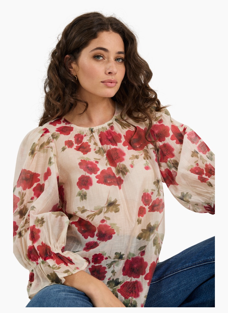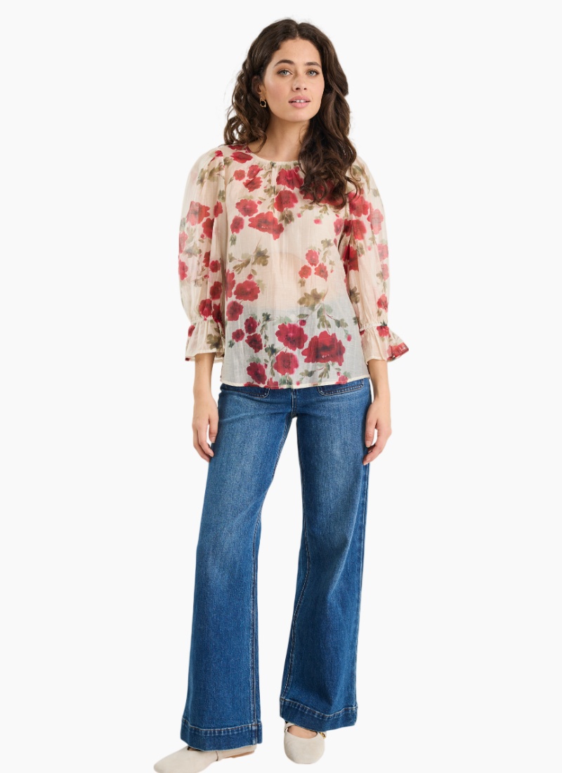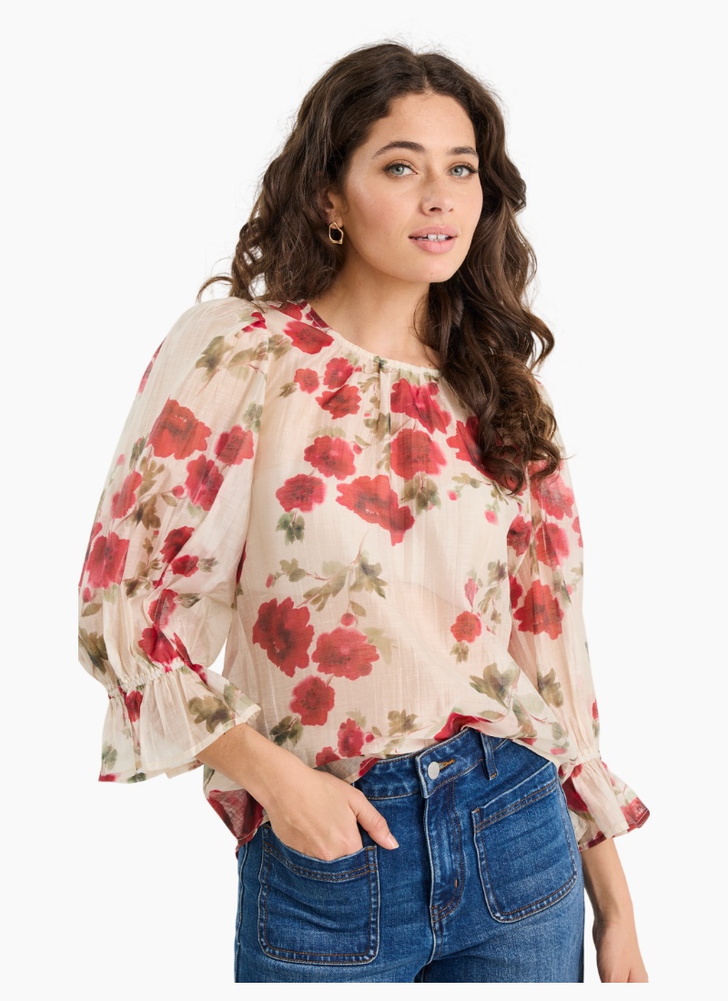 Fresh, floaty and full of romantic charm, the Candid top from Ivy + Jack brings painterly florals to life with soft volume and effortless drape. The mid sleeves and crew neckline offer easy wearability, while gentle gathers and puffed shoulders create a feminine silhouette that moves with grace. The semi-sheer finish adds a dreamy touch that’s perfect for layering over your favourite camis.