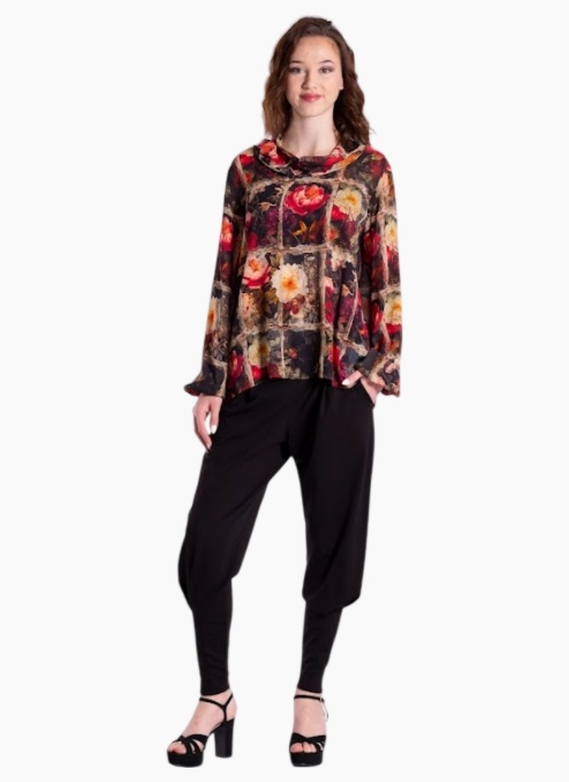 Introducing the Drape Floral Top from Jellicoe. This drapey, painterly blouse brings a touch of bohemian elegance to your wardrobe with rich florals on a dark base.
