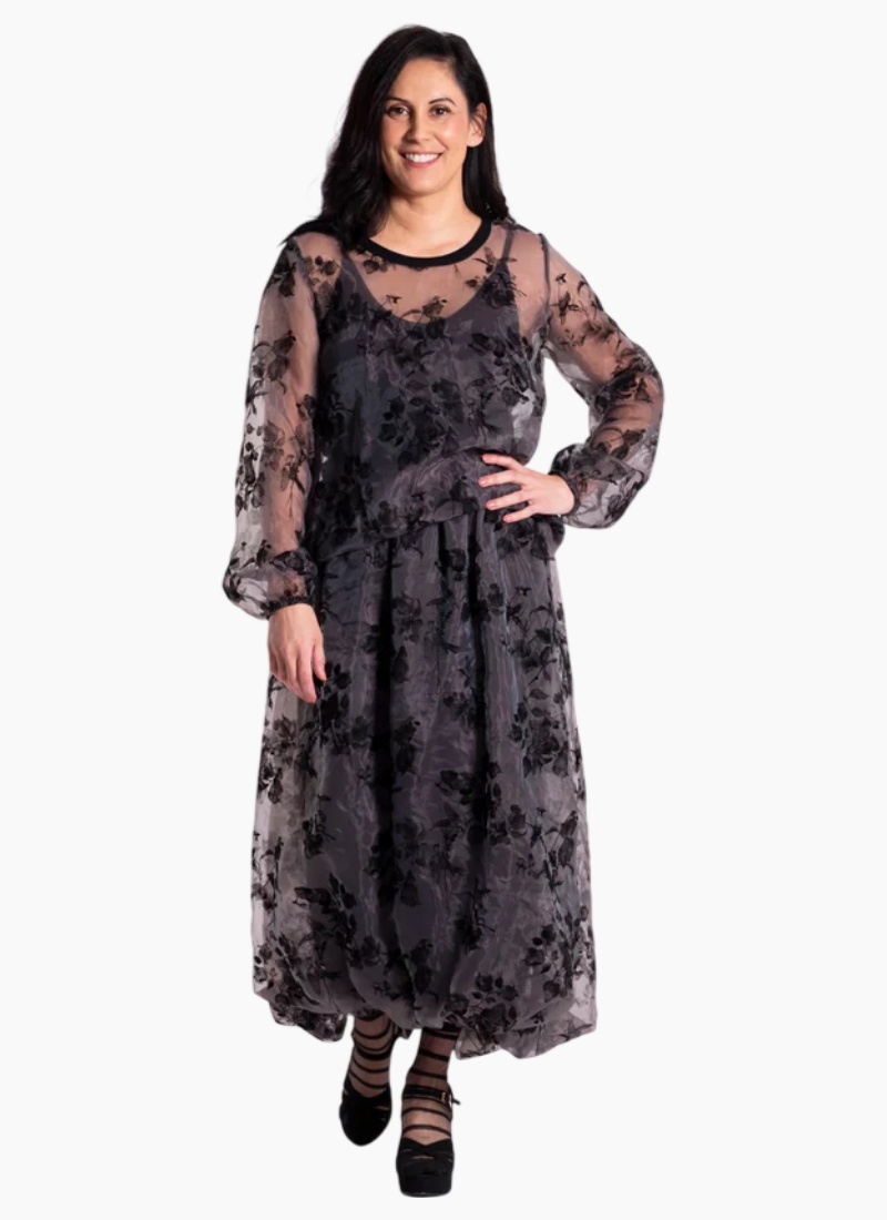 - Sheer long sleeves and a relaxed bodice offer effortless layering over a slip or camis