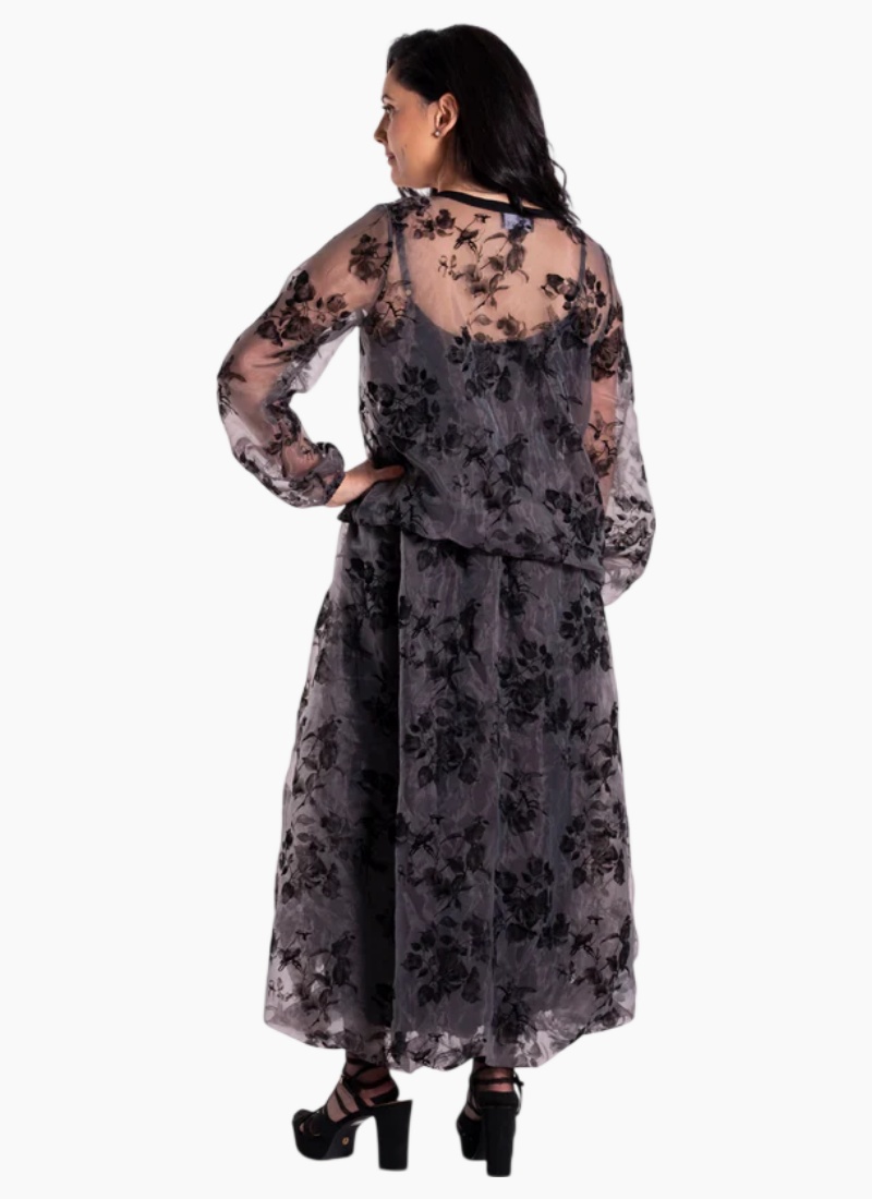 - Crafted as a Tops piece in black from lightweight sheer organza with a flocked velvet floral overlay for tactile depth