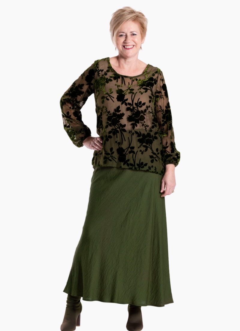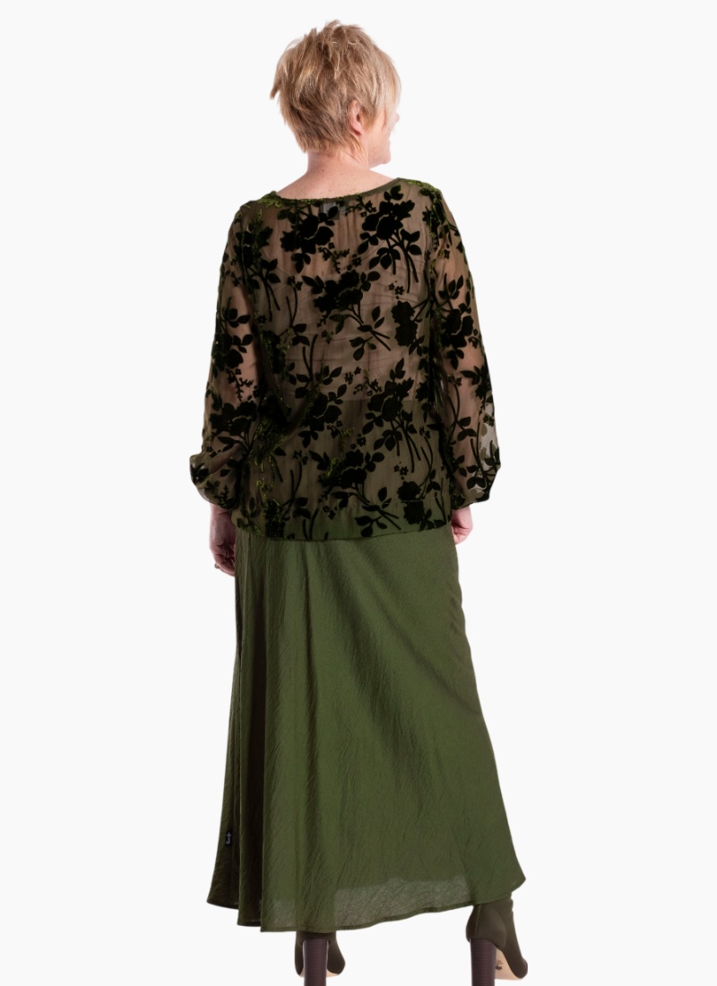 Introducing the Lattice Velvet Top -forest bloom from Jellicoe. This elegant women's top pairs a sheer base with floral velvet devoré for a refined, textured look.