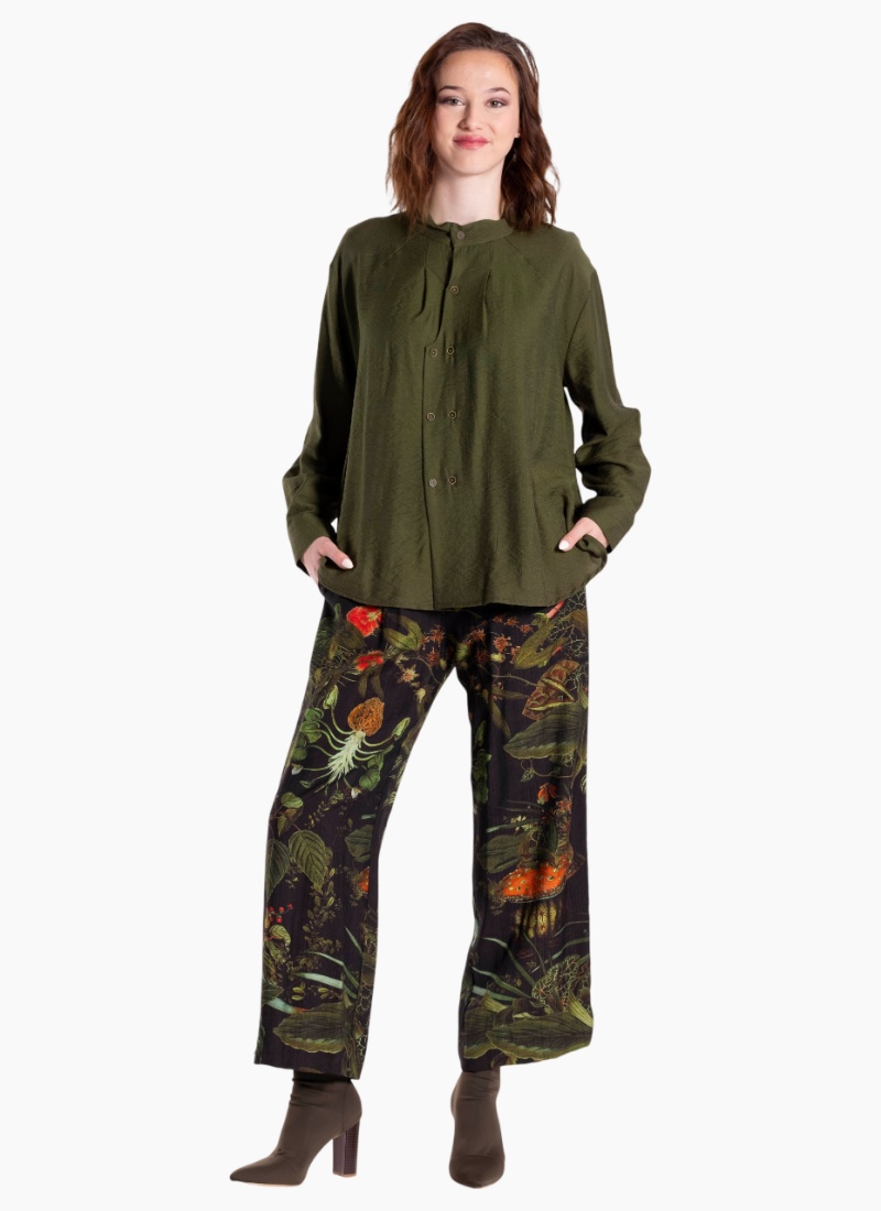 - Meadow Green colour pairs beautifully with tailored trousers or printed wide-leg pants for a contemporary boutique finish