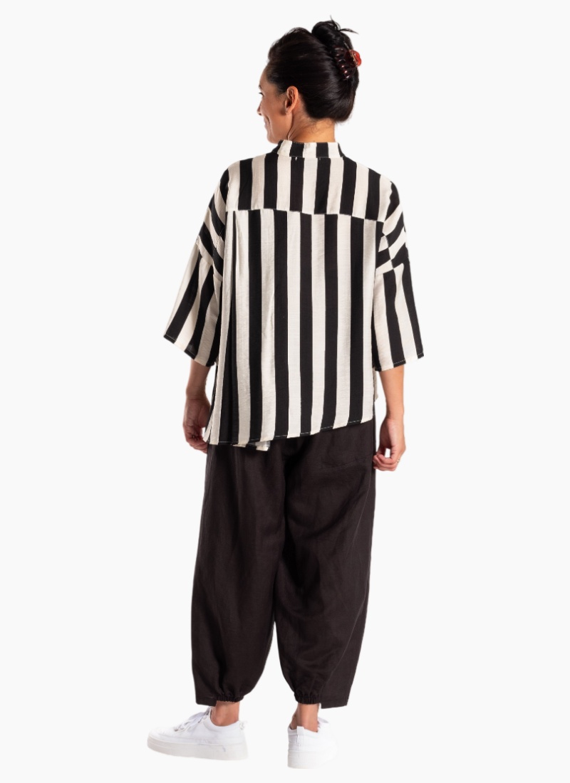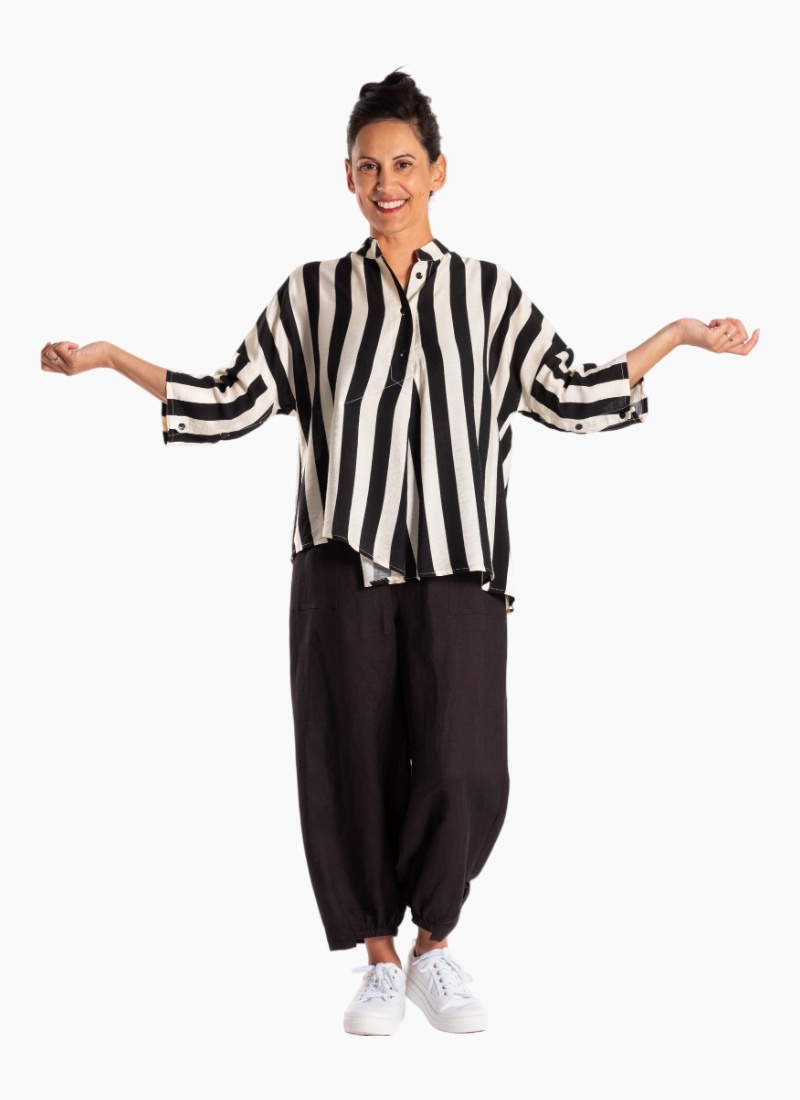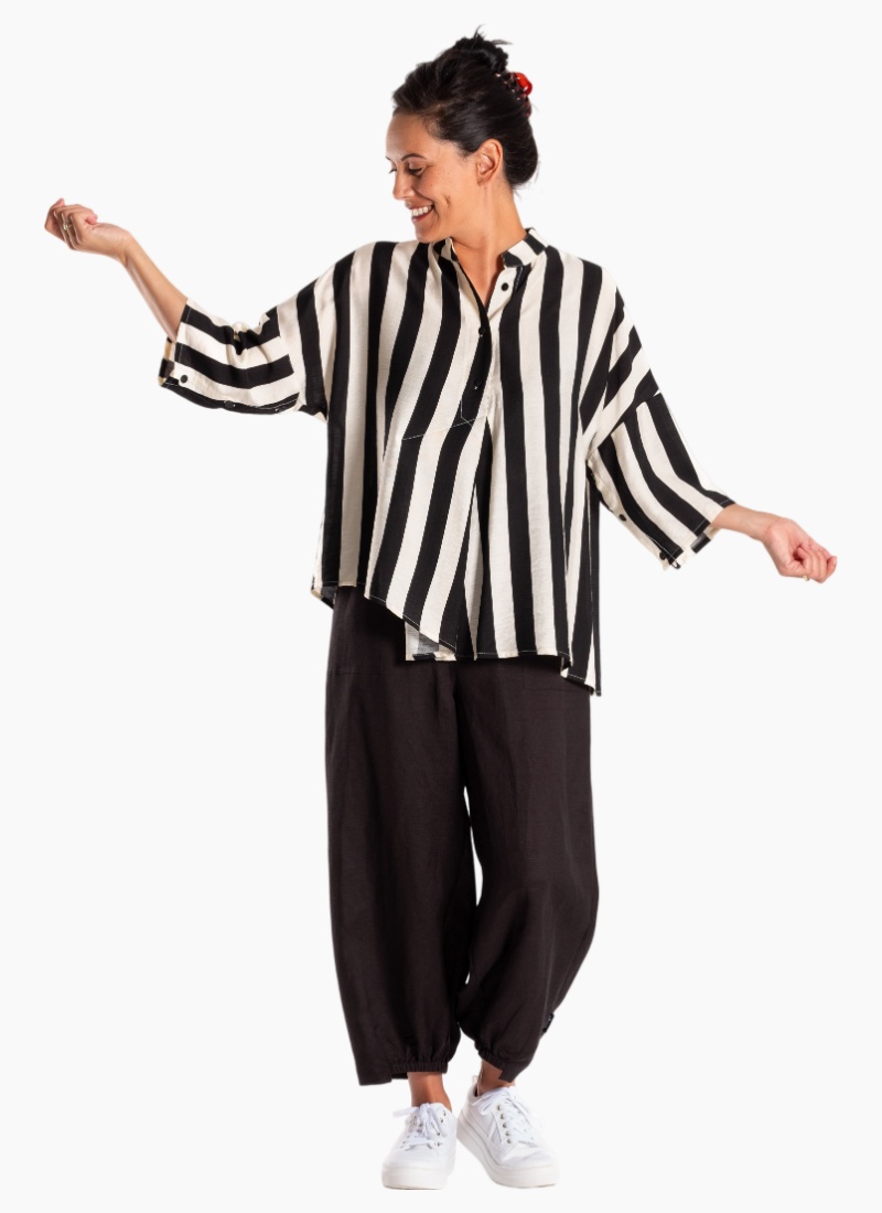 Introducing the Phoenix Shirt 25-124 Black Stripe from Jellicoe. This relaxed, statement stripe shirt blends bold black and white colour with an airy linen feel for an easy, contemporary edit.
