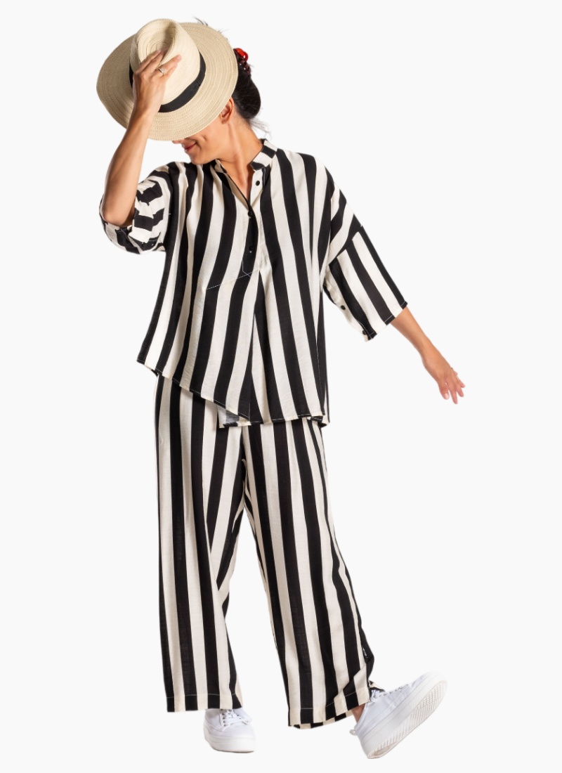 - Bold vertical black-and-white stripes make a confident style statement