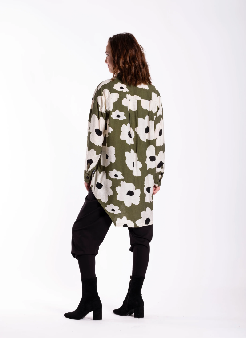 - Olive green base with oversized monochrome meadow blooms for a striking colourway