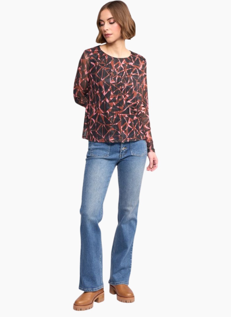 Introducing the APEX Top - Dusk from Knewe. A contemporary geometric-print blouse designed to lift everyday looks with a modern, arty edge.