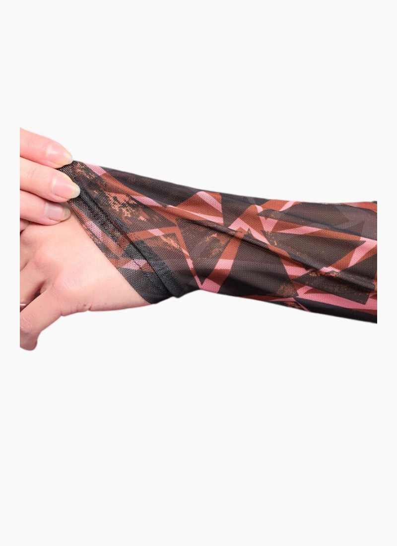 - Crafted from lightweight sheer mesh (polyester) in black with dusky-pink geometric print for striking contrast and subtle translucence