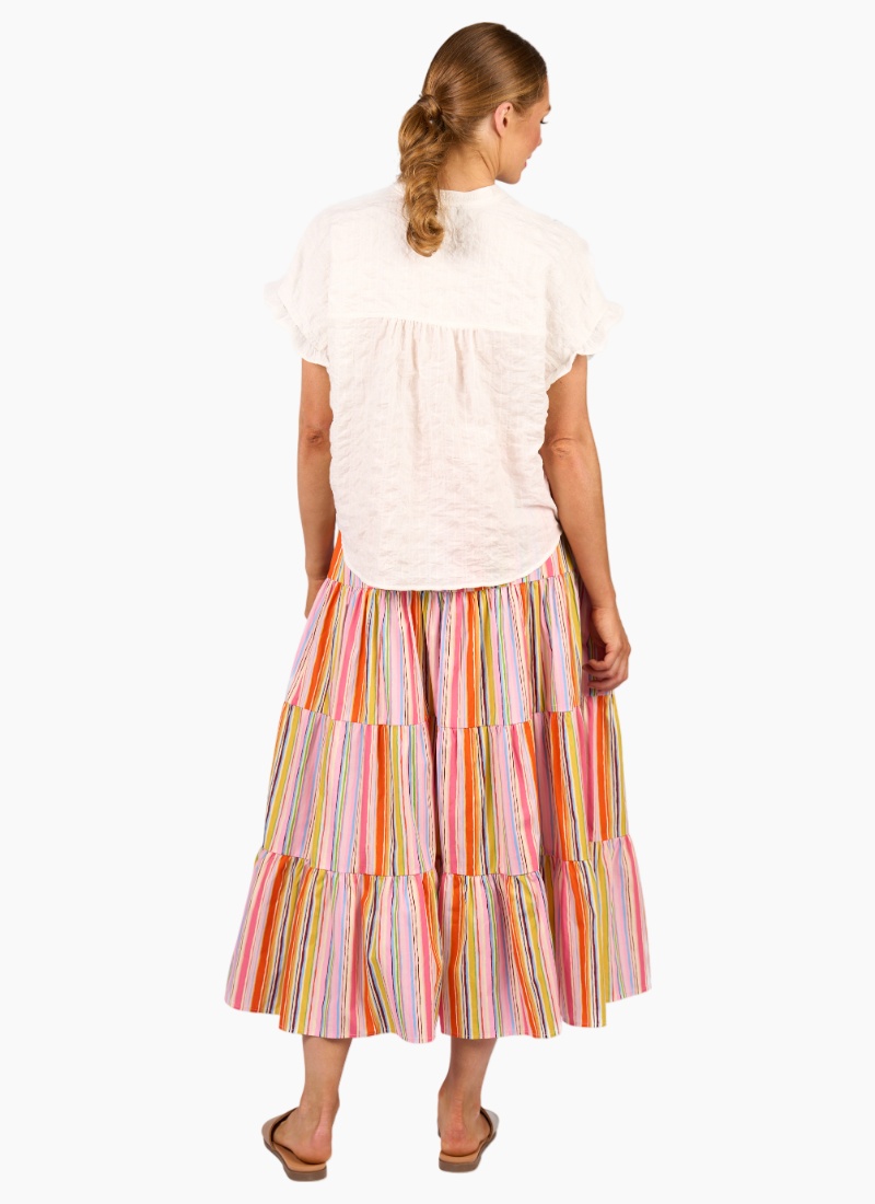 The Addison Top is a lightweight summer favourite with a relaxed fit and feminine frill cuffs. Its V-neck and shirred detailing add subtle charm, making it perfect to wear on its own for effortless style.• Made from a lightweight cotton fabric with a textural checkered pattern • Drop shoulder with short sleeves and frill cuff • V-neck with flat mandarin collar • Front shirring detail across chest and sleeves • Button up front with mother of pearl buttons • Back yoke • Curved front and back hem, dipping lower at back • Relaxed fit • Model wears size 10 100% Cotton Pairs Beautifully with the KNEWE Kaia bonbon Skirt