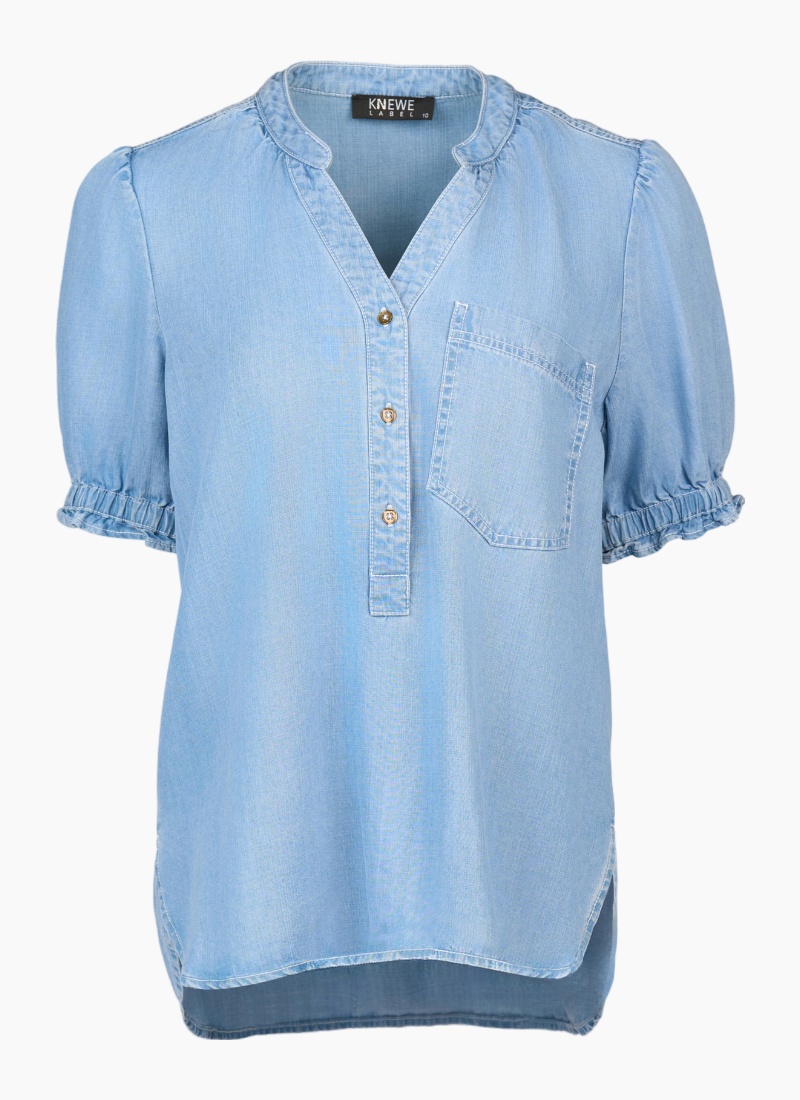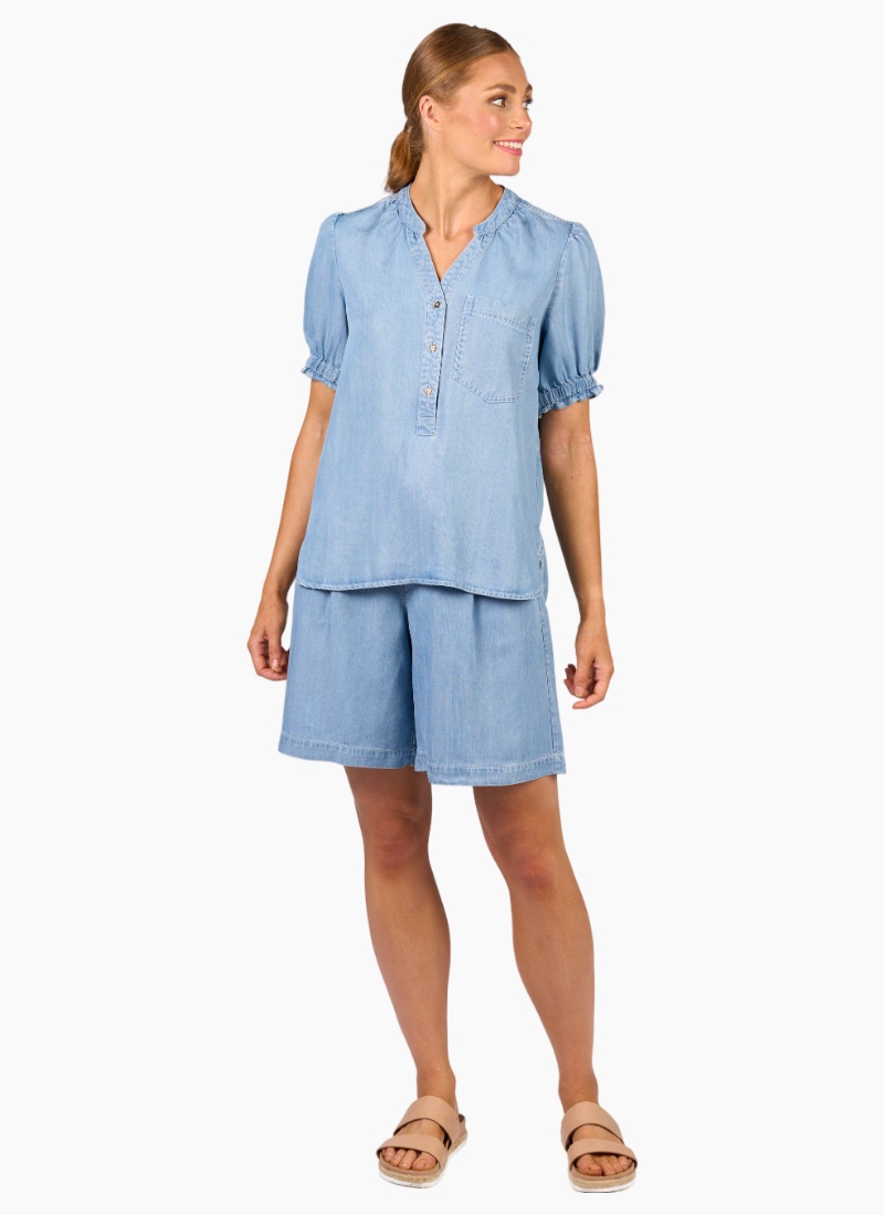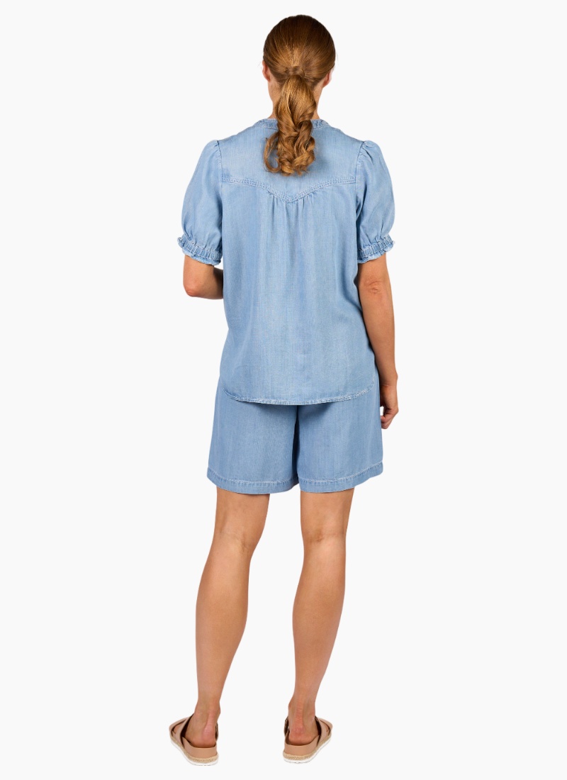 The Naomi Top is a relaxed summer favourite made from a soft, lightweight tencel fabric with a denim look. It features short puffed sleeves with shirring at the cuffs, a V-neck with a flat mandarin collar, and a button-up chest. The softly rounded hem dips lower at the back for easy, laid-back style.• Made from a lightweight tencel fabric • Short puffed sleeve with shirring detail around cuff • Chest patch pocket • V-neck with flat mandarin collar • Button-up chest • Round hems with side split seam • Hem dips lower at the back • Relaxed fit • Model wears size 10 100% Tencel