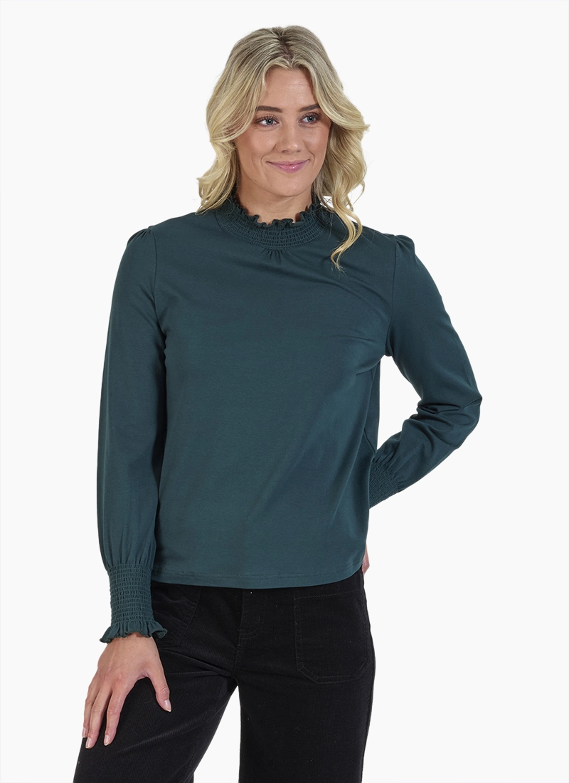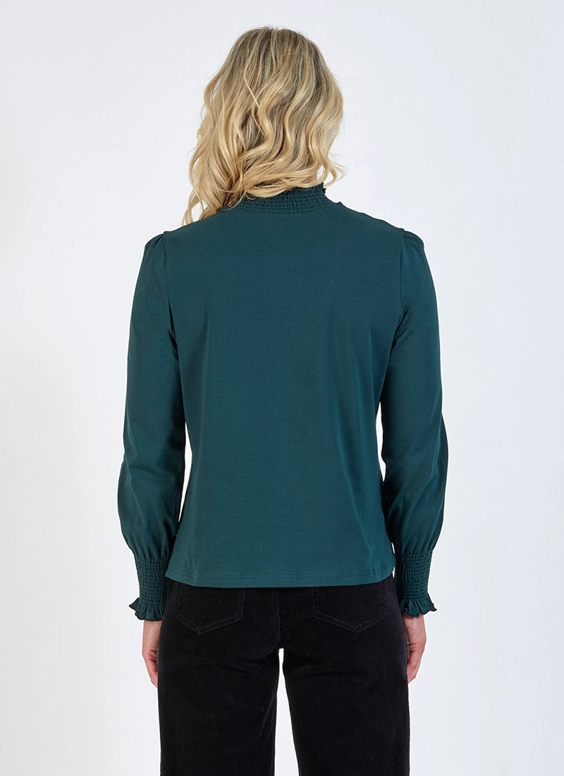 • Long sleeves gathered at shoulder and cuff