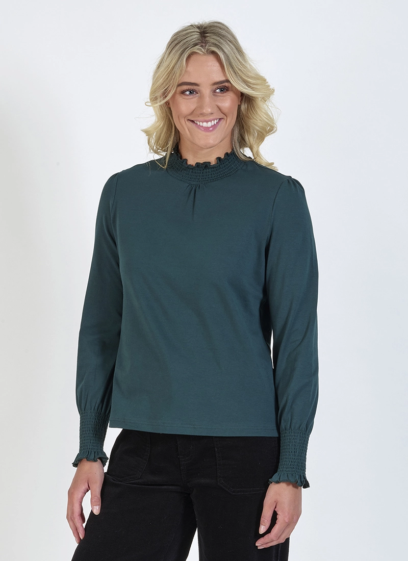 • Shirred high neck and cuffs with ruffle edge and babylocked finish