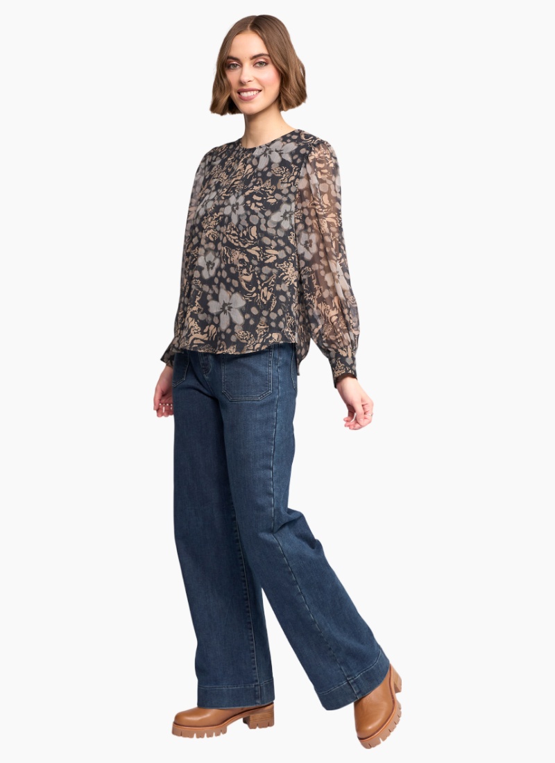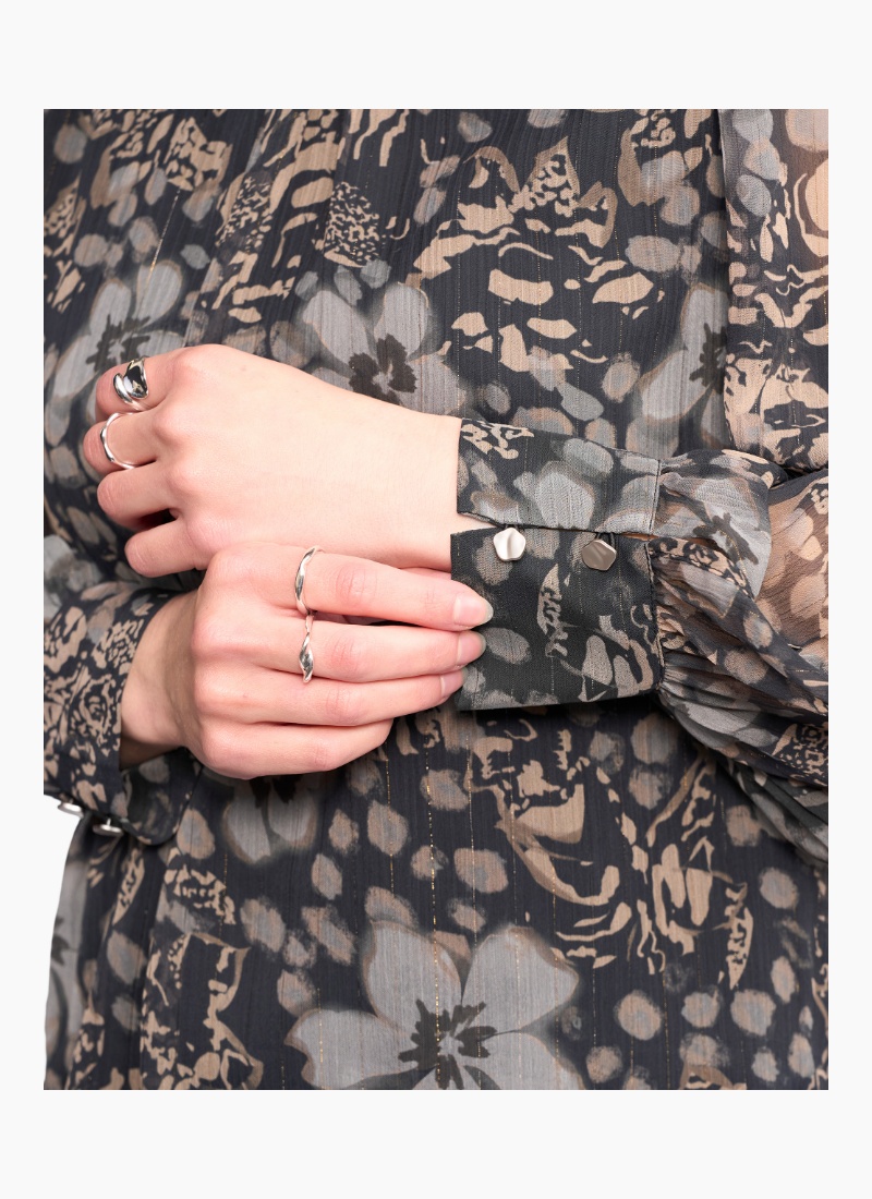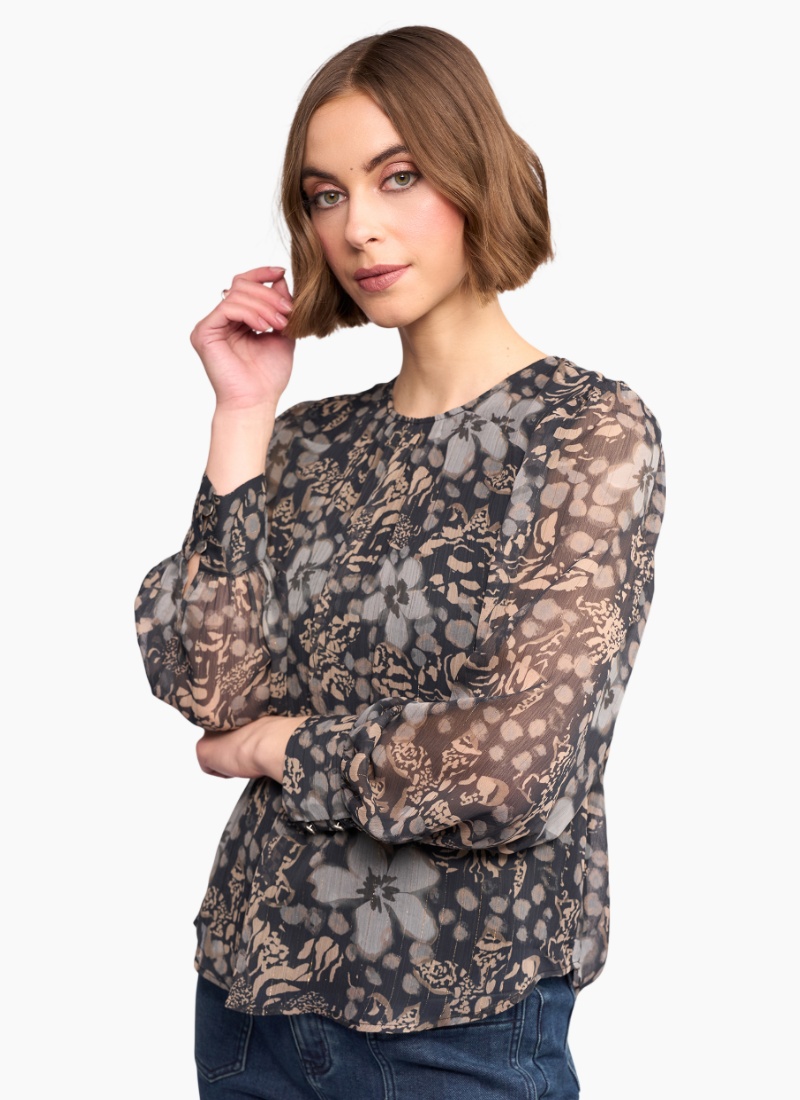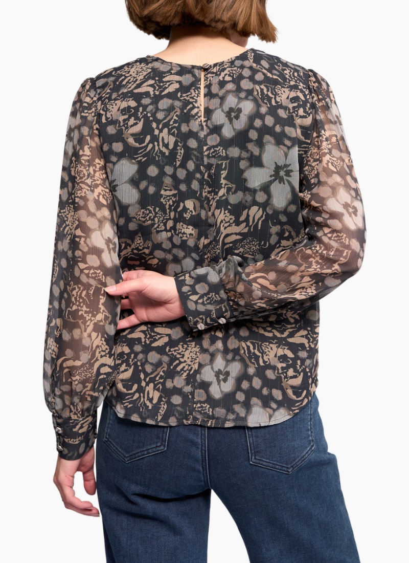 Long sleeve top in the Hazy print, a gold-green floral pattern on a blackbase. Featuring wide sleeves finished with barrel cuffs secured with two spherical buttons, a round neckline with back button loop closure, and a centre back seam. Main: 100% Polyester Lining: 100% Rayon • Round neckline with centre back keyhole with elastic loop fastening • Long sleeves finishing in double-button barrel cuffs • Gathered neckline for subtle shaping • Centre back seam from neckline closure to hem • Rounded front and back hems, dipping in back • Relaxed, floaty fit • Model wears size 10