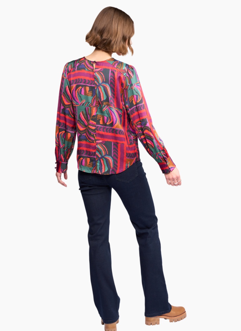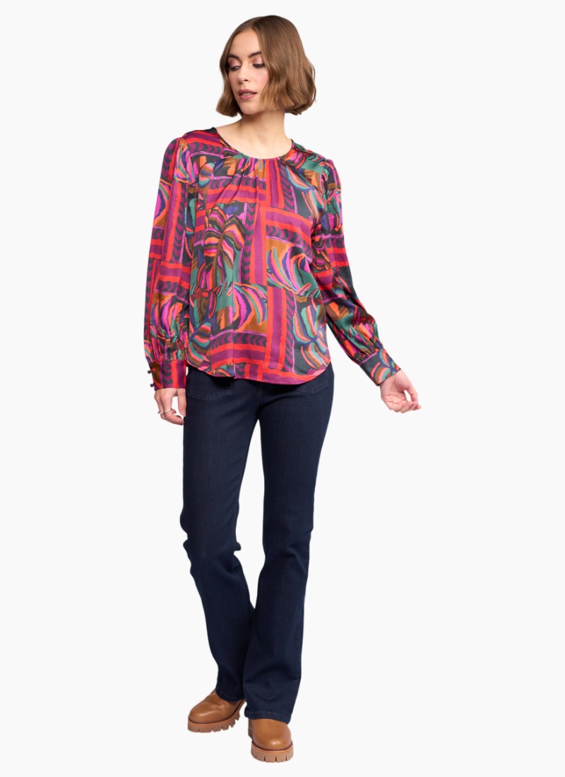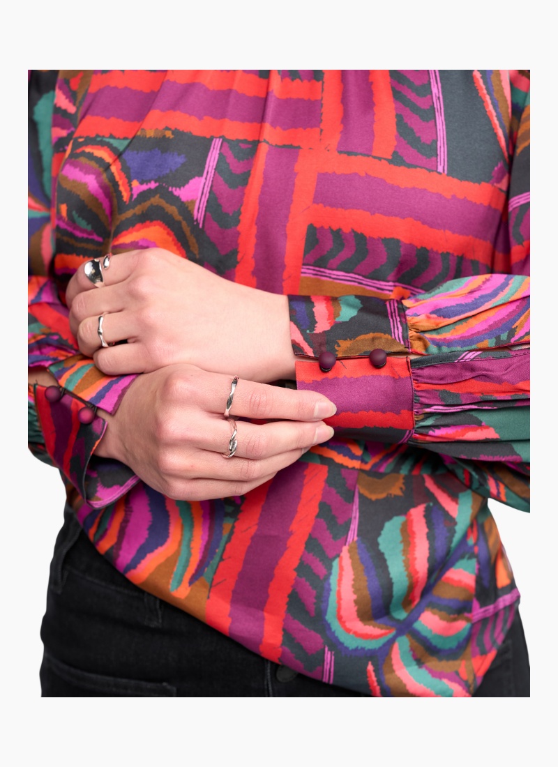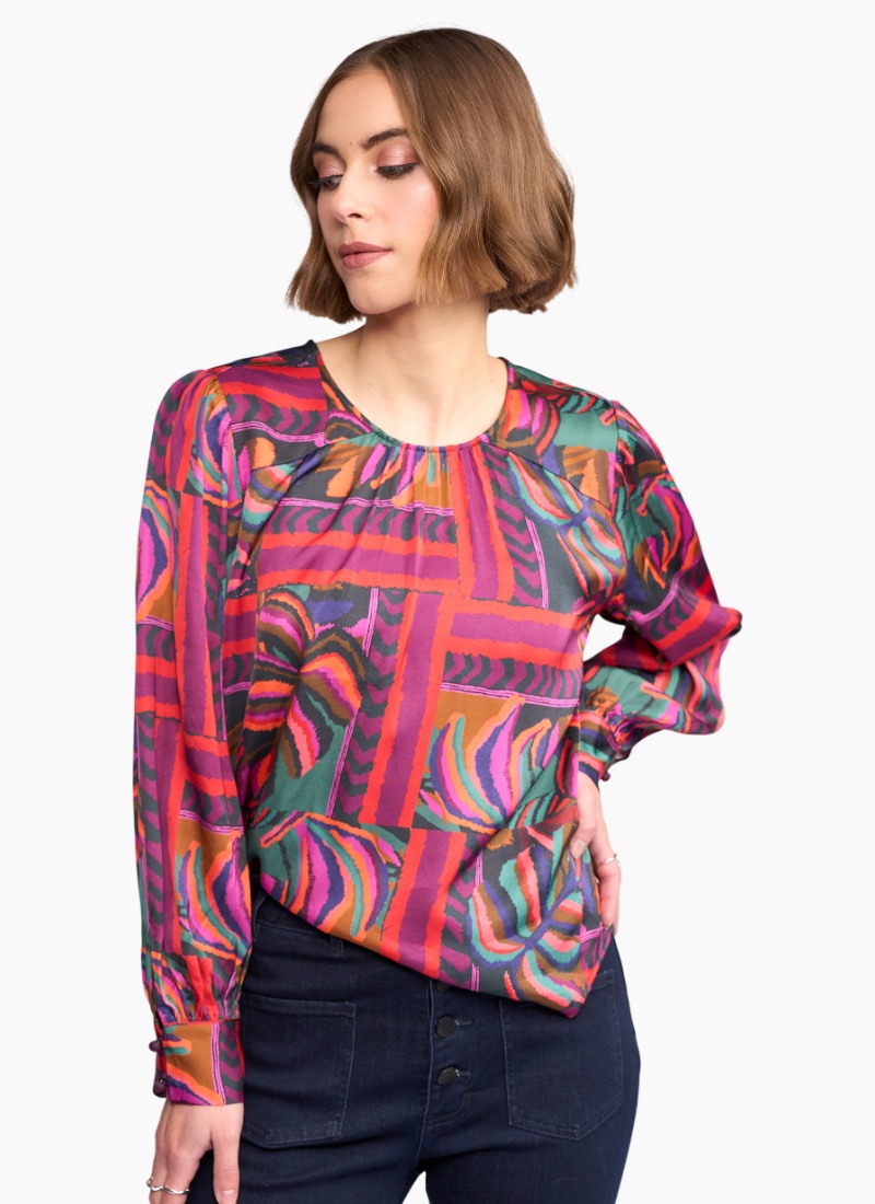 Long sleeve top in the Sunset print — a bold pattern of pink-reds, mauve, orange, dark blue, and green — crafted from a soft viscose-rayon blend. Featuring wide sleeves finished with barrel cuffs secured with two spherical buttons, a round neckline with back button loop closure, and a centre back seam.• Round neckline with centre back keyhole with elastic loop fastening • Long sleeves finishing in double-button barrel cuffs • Gathered neckline for subtle shaping • Centre back seam from neckline closure to hem • Rounded front and back hems, dipping in back • Relaxed, floaty fit • Model wears size 10 50% Viscose 50% Rayon