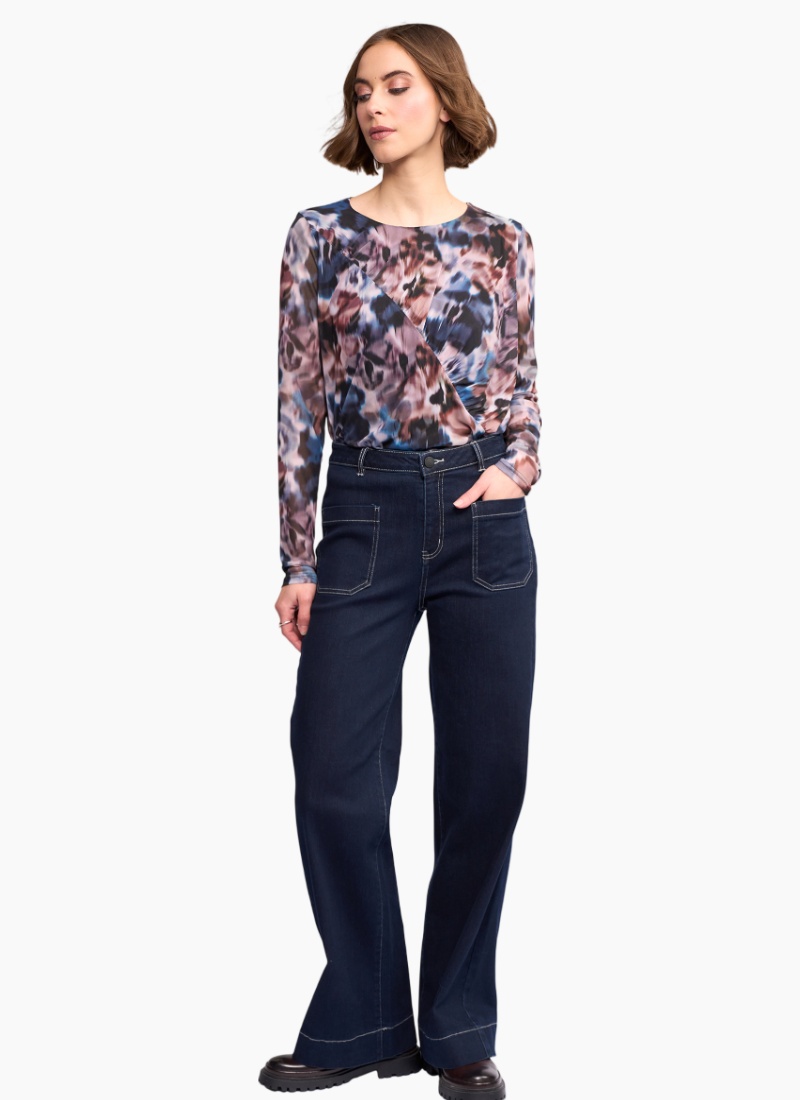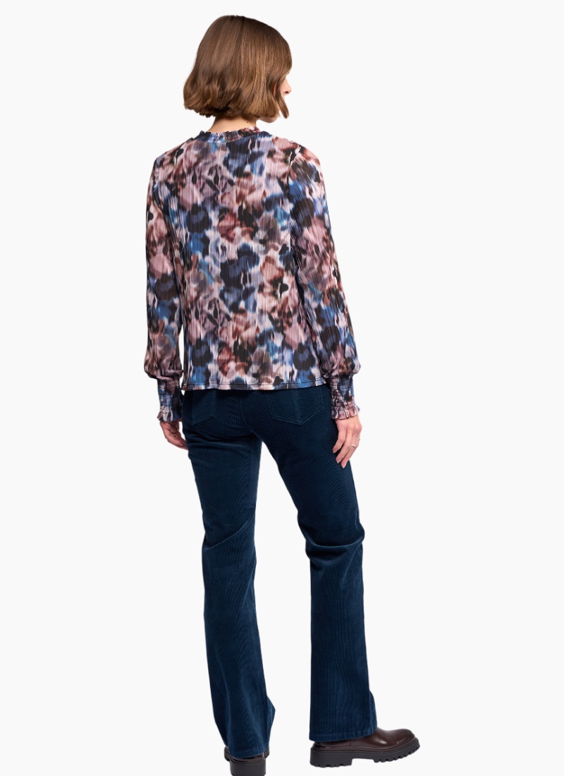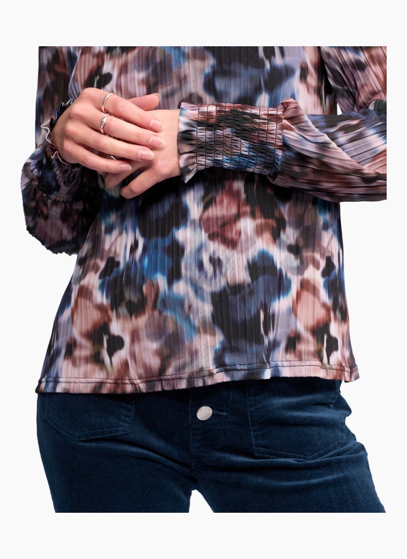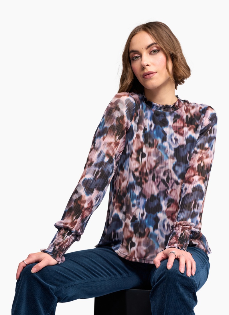 Long sleeve mesh top in Celine, a fluid abstract print in dark blue, burgundy, purple and white. Made from stretchy crinkle fabric with a lined body for coverage. Featuring a shirred high neck and long sleeves that gather into ruffled cuffs.