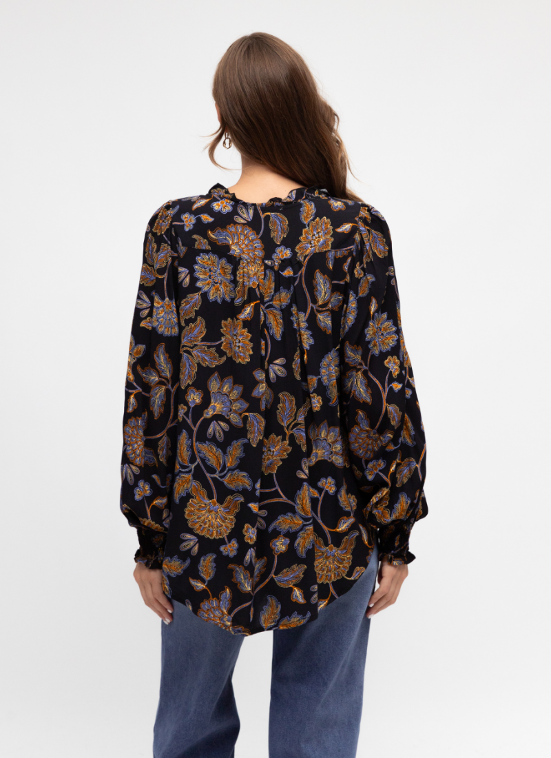 - Rich black base with an inked floral print in gold and indigo for a distinctive, wearable colour story
